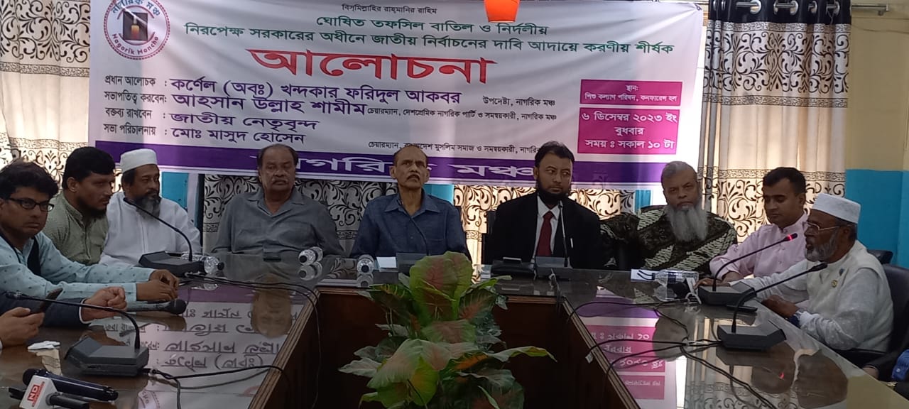 নিজস্ব প্রতিবেদকঃ আজ ৬ ডিসেম্বর সকাল ১০ টায় তোপখানা রোডস্থ শিশুকল্যাণ পরিষদ মিলনায়তনে নাগরিক মঞ্চের উদ্যোগে ঘোষিত তফসিল বাতিল ও নির্দলীয় নিরপেক্ষ সরকারের অধীনে জাতীয় নির্বাচনের দাবি আদায় করণীয় শীর্ষক আলোচনা সভায় নাগরিক মঞ্চের সমন্বয়কারী বাংলাদেশ মুসলিম সমাজের চেয়ারম্যান মাসুদ হোসেন বলেন, “২০১৪ সালে আধিপত্যবাদী রাষ্ট্র ভারতের প্রত্যক্ষ সহযোগিতায় সরকারের আজ্ঞাবহ নির্বাচন কমিশন দিয়ে একতরফা নির্বাচন করে ১৫৪ সিটে বিনা প্রতিদ্বন্দ্বিতায় নির্বাচিত হয়ে সরকার গঠন করে বর্তমান ক্ষমতাসীন স্বৈরাচারী আওয়ামী সরকার। তারই ধারাবাহিকতায় রাষ্ট্রযন্ত্রকে অবৈধভাবে ব্যবহার করে জনগণকে জুজুর ভয় ও রাজনৈতিক দলগুলোকে নিবন্ধন হারানের ভয় দেখিয়ে ২০১৮ সালের আরো একটি একতরফা নির্বাচনে যেতে বাধ্য করে। তখন দিনের ভোট রাতে করে জনগণকে ধোকা দিয়ে আরো একটি প্রহসনের নির্বাচনের নাটক মঞ্চস্থ করে পুনরায় ক্ষমতা ধরে রাখে। এখন তারা আবারো ভারতের পরোক্ষ সহযোগিতায় ২০২৪ সালের দ্বাদশ নির্বাচনের অবৈধ তফসিল ঘোষণা করে দেশকে সংকটের মধ্যে ফেলে দিয়েছে। বিরোধী দলগুলোর মত প্রকাশের স্বাধীনতা কেড়ে নিয়েছে। তাদের উপর গুম—খুন—জুলুম—নির্যাতন চালিয়েছে। বিরোধী দলের লক্ষ লক্ষ নেতাকর্মী ঘরবাড়ি ছেড়ে ক্ষেত খামারে বনেজঙ্গলে পালিয়ে বেড়াচ্ছে। নেতাকর্মীদের না পেয়ে পুলিশ তাদের পরিবারের সদস্যদের গ্রেফতার করে নিয়ে যাচ্ছে। অন্যদিকে নাম ঠিকানা অস্তিত্বহীন কিছু রাজনৈতিক দলকে নিবন্ধন দিয়ে তাদের অধীনে নির্বাচনে নিয়ে জাতির সামনে ৭ই জানুয়ারি নতুন নাটক মঞ্চস্থ করতে যাচ্ছে। এই পরিস্থিতিতে দেশ গৃহযুদ্ধের দিকে ধাবিত হচ্ছে। দেশের এই সংকটকালীন সময় সকল গণতান্ত্রিক শক্তিকে ঐক্যবদ্ধ ভাবে রাজপথে নেমে এসে দুর্বার গণআন্দোলনের মাধ্যমে এই স্বৈরাচার সরকারকে বিদায় করতে হবে।
