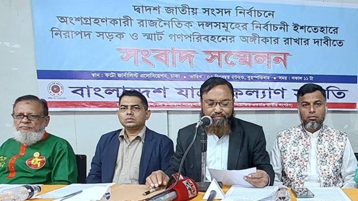 আজ ০৭ ডিসেম্বর বৃহস্পতিবার সকালে, রাজধানীর ফটো জার্নালিস্ট এসোসিয়েশন মিলয়াতনে দ্বাদশ জাতীয় সংসদ নির্বাচনে অংশগ্রহণকারী রাজনৈতিক দল ও জোটের নির্বাচনী ইশতেহারে নিরাপদ সড়ক ও র্স্মাট গণপরিবহন ব্যবস্থা গড়ে তোলার অঙ্গীকার রাখার দাবীতে আয়োজিত এক সংবাদ সম্মেলনে বাংলাদেশ যাত্রী কল্যাণ সমিতির মহাসচিব মোঃ মোজাম্মেল হক চৌধুরী এই দাবী জানান।