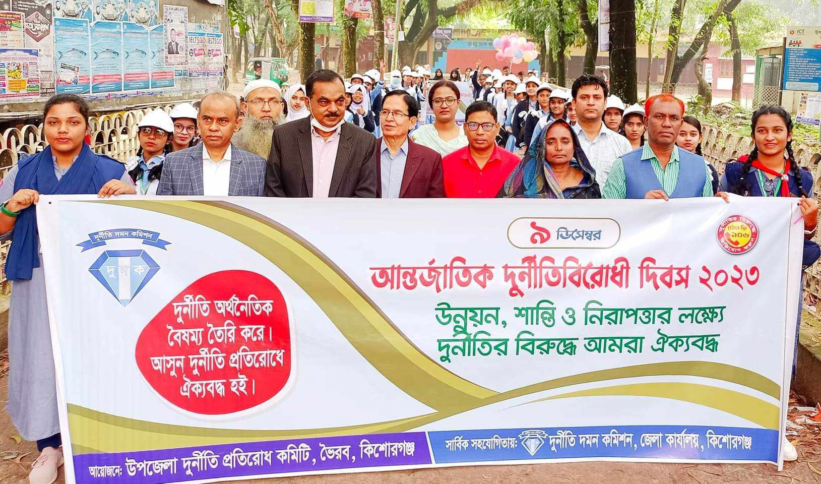 ভৈরব (কিশোরগঞ্জ) প্রতিনিধি: কিশোরগঞ্জ ভৈরবে আন্তর্জাতিক দুর্নীতি বিরোধী দিবস উদযাপন উপলক্ষে মানববন্ধন ও দুর্নীতি দমন প্রতিরোধে করনীয় শীর্ষক আলোচনা সভা অনুষ্ঠিত হয়েছে। আজ ৯ ডিসেম্বর শনিবার উপজেলা চত্বরে মানববন্ধন শেষে উপজেলা পরিষদে বঙ্গবন্ধু হলরুমে এই সভার আয়োজন করা হয়।