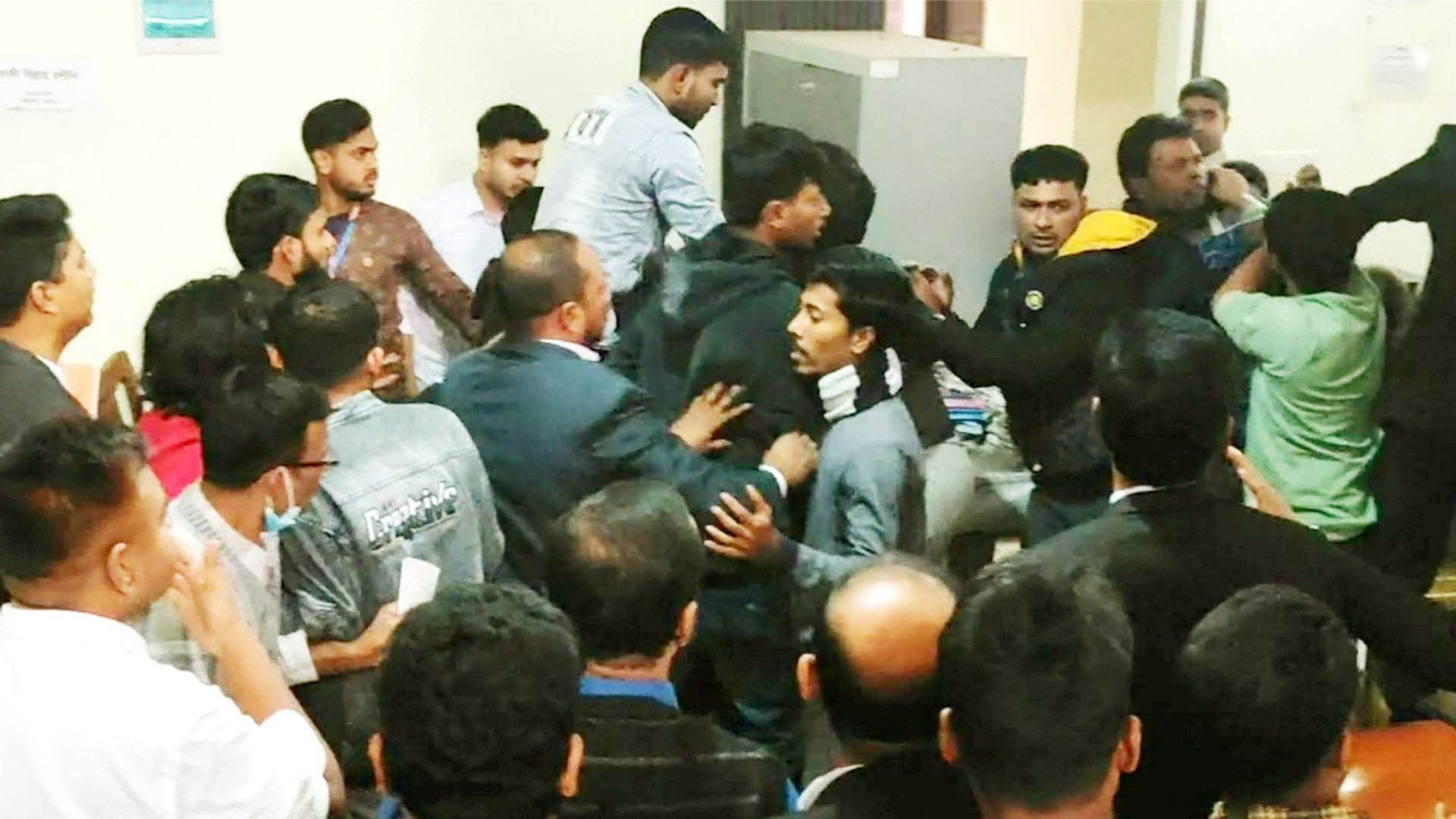 ঘটনা শুনে আইনজীবী শাহ মখদুম রূপশ তার মক্কেলকে মারধরের বিষয়টি জানতে এ্যাড. দীনেশ চন্দ্র মন্ডলের মক্কেল লালন, লিমন এবং লিখনকে জিজ্ঞাসাবাদ করতে গেলে শাহ মখদুম রূপশের সাথে তর্কে জড়ায় তারা। এসময় অন্যান্য আইনজীবী এবং আইনজীবীর সহকারীরা লালন, লিমন এবং লিখনকে কিলঘুষি এবং লাঠি দিয়ে মারধর করে।