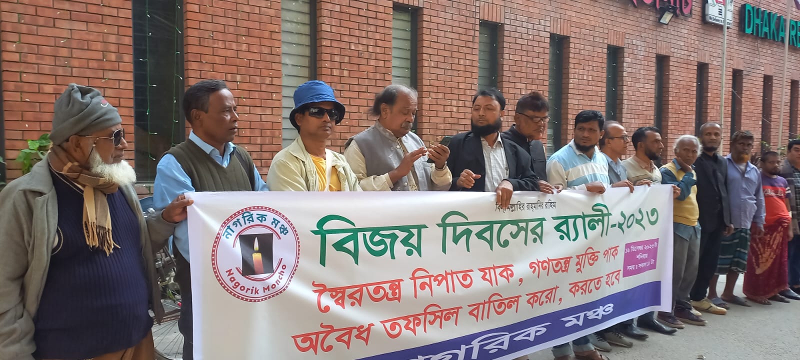 নিজস্ব প্রতিবেদকঃ আজ ১৬ই ডিসেম্বর ২০২৩ মহান বিজয় দিবস উপলক্ষে সেগুনবাগিচা রিপোর্টার্স ইউনিটির সামনে থেকে নাগরিক মঞ্চের উদ্যোগে স্বৈরতন্ত্র নিপাত যাক গণতন্ত্র মুক্তি পাক শ্লোগানে অবৈধ তফসিল বাতিল ও সরকারের পদত্যাগের এক দফা দাবিতে বিক্ষোভ মিছিল পূর্ব সংক্ষিপ্ত সমাবেশে নাগরিক মঞ্চের সমন্বয়কারী ও বাংলাদেশ মুসলিম সমাজের চেয়ারম্যান মোহাম্মদ মাসুদ হোসেন বলেন, স্বাধীনতার ৫০ বছর অতিক্রম হলেও জনগণ স্বাধীনতার সুফল হতে বঞ্চিত। আধিপত্যবাদী গোষ্ঠীর পরিকল্পিত ফর্মুলায় আমাদের শিক্ষা সংস্কৃতি বিচার ব্যবস্থা ব্যবসা—বাণিজ্য অর্থনীতি সহ গোটা রাষ্ট্র ব্যবস্থা ভেঙে পড়ার উপক্রম হয়েছে। একদলীয় স্বৈরতান্ত্রিক শাসন ব্যবস্থার ফলে আঞ্চলিক শাসন ব্যবস্থা ভেঙে পড়ার উপক্রম হয়েছে, দেশ গভীর সংকটে নিপতিত হয়েছে। স্বাধীনতা সার্বভৌমত্ব হুমকির মুখে, দেশ গৃহযুদ্ধের দিকে ধাবিত হচ্ছ। স্বৈরতান্ত্রিক সরকার ক্ষমতা দীর্ঘায়িত করার লক্ষ্যে দেশের জাতীয় নিরাপত্তা সহ দেশের জলাঞ্জলি দিতে কুণ্ঠাবোধ করছে না। এমন অবস্থায় দেশ ও দেশের জনগণকে রক্ষা করতে সকল বিরোধী রাজনৈতিক দল গুলোকে এক মঞ্চে এসে জনগণকে সঙ্গে নিয়ে গণঅভ্যুত্থানের মাধ্যমে স্বৈরতান্ত্রিক সরকারের বিদায় ঘন্টা বাজিয়ে গণতন্ত্র ফিরিয়ে আনতে হবে।