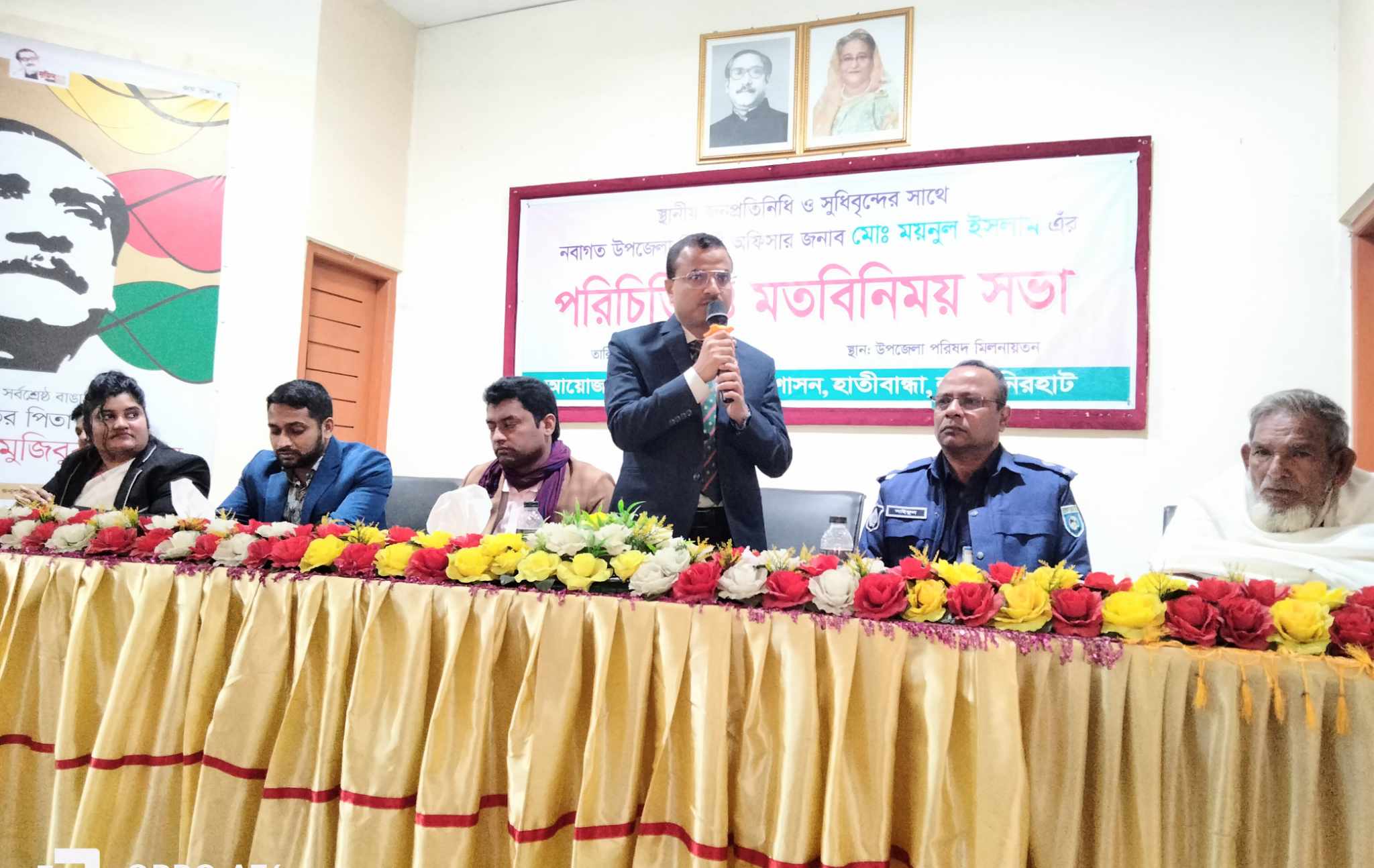 হাতীবান্ধা সংবাদদাতা: লালমনিরহাটের হাতীবান্ধা উপজেলায় স্থানীয় জনপ্রতিনিধি ও সুধিবৃন্দ ও সাংবাদিকদের সাথে নবাগত উপজেলা নির্বাহী কর্মকর্তা ময়নুল ইসলামের পরিচিতি ও মতবিনিময় সভা অনুষ্ঠিত হয়েছে।