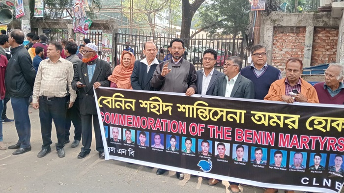 আজ ২৩ ডিসেম্বর ২০২৩ (শনিবার) সকালে জাতীয় প্রেসক্লাবের সম্মুখে বেনিন শহীদ শান্তিসেনা দিবস উপলক্ষে সিএলএনবি’র উদ্যোগে শান্তি সমাবেশ অনুষ্ঠিত হয়। উল্লেখ্য, পশ্চিম আফ্রিকার দেশ লাইবেরিয়া ও সিয়েরা লিওন থেকে শান্তি মিশন সমাপ্ত করে ১৫ সেনা কর্মকর্তা দেশে ফেরার পথে ২০০৩ সালে ২৫ ডিসেম্বর বেনিন সাগর উপকূলে বিমান দুর্ঘটনায় শহীদ হন।