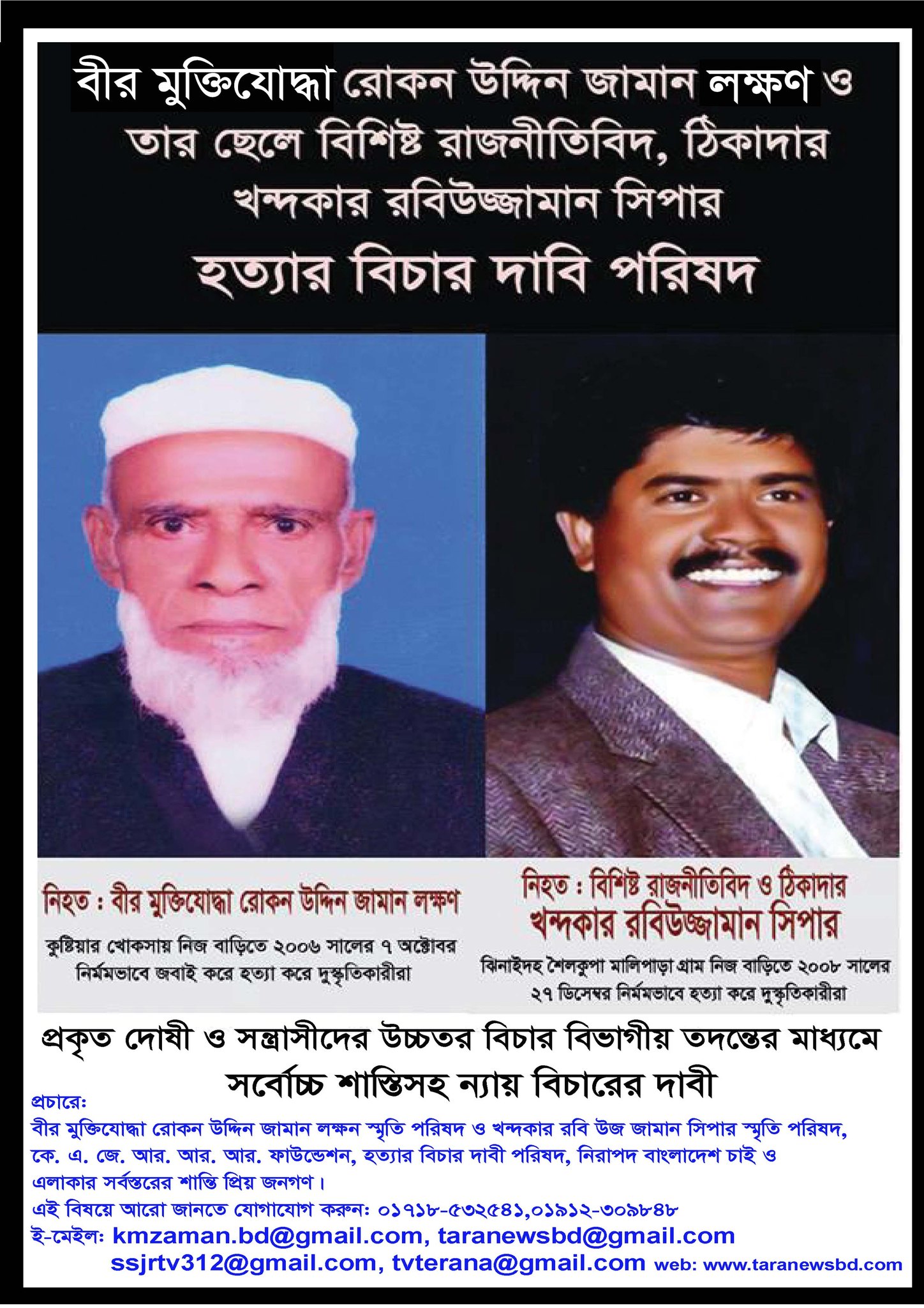 নিজস্ব প্রতিবেদকঃ পিতা বীর মুক্তিযোদ্ধা রোকন উদ্দিন জামান (লক্ষণ) ও ভাই বিশিষ্ট রাজনীতিবিদ ও ঠিকাদার খন্দকার রবিউজ্জামান সিপারের হত্যাকান্ডের বিচার দীর্ঘ ১৭ বছরেও না পেয়ে ১ জানুয়ারি জাতীয় প্রেসক্লাবের সামনে প্রতিবাদী অবস্থান ও সংবাদ সম্মেলন করেছেন সাংবাদিক খন্দকার মাসুদ উজ জামান।