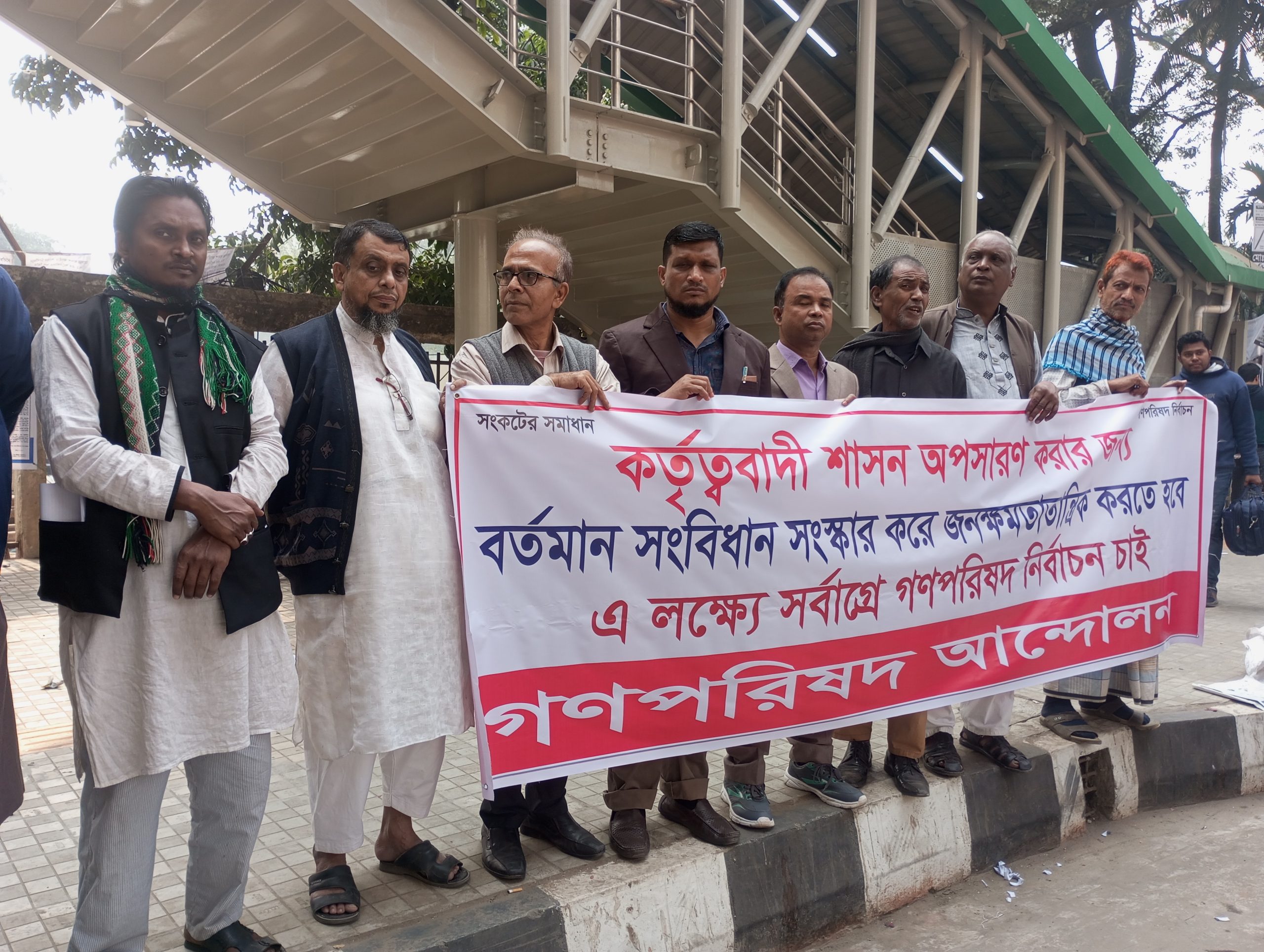 প্রেস বিজ্ঞপ্তি: আজ ৪ জানুয়ারি ২০২৪ বৃহস্পতিবার সকাল ১১ টা ৩০ মিনিটে জাতীয় প্রেসক্লাবের সম্মুখে গণপরিষদ আন্দোলন আয়োজিত মানববন্ধনে বাংলাদেশ মুসলিম সমাজের চেয়ারম্যান মাসুদ হোসেন বলেন, একতরফা নির্বাচনী তফসিল ঘোষণা করায় দেশ গভীর সংকটে নিমজ্জিত। এরই মধ্যে একদল কেন্দ্রিক ডামি নির্বাচন করে স্বৈরাচার সরকার তার নতুন লাইসেন্স নবায়ন করার উদ্দেশ্যে দলীয় প্রার্থী, স্বতন্ত্র প্রার্থী, ডামি প্রার্থী বিভিন্ন নামে বেনামে প্রার্থী দিয়ে নিজেদের ভেতরে ক্ষমতা ভাগাভাগির প্রশ্নে অন্তর্দ্বন্দ্ব কোলাহ করে এরই মধ্যে বেশ কয়েকটি তাজা প্রাণ হারিয়েছে, অসংখ্য মানুষ আহত হয়ে হাসপাতালে কাতরাচ্ছে। পরিস্থিতি দিনকে দিন ভয়াবহ রূপ নিচ্ছে। দ্রব্যমূল্যের লাগামহীন উর্ধ্বগতি, আইনশৃঙ্খলা থেকে শুরু করে সবকিছু সরকারের নিয়ন্ত্রণের বাইরে। বিরোধীদলকে দমনের লক্ষ্যে রাষ্ট্রযন্ত্রকে অবৈধভাবে ব্যবহার করে বিরোধী দলের হাজার হাজার নেতাকর্মীকে জেলখানায় আবদ্ধ রেখেছে। বেশ কয়েকজন নেতাকর্মী জেলখানায় মৃত্যুবরণ করেছে। অনেককে মিথ্যা মামলায় সাজা দিয়েছে।