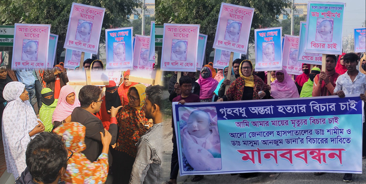 বুধবার (১০ জানুয়ারি) ঈশ্বরদী হাসপাতাল রোডে আলো জেনারেল হাসপাতালের সামনে এই মানববন্ধন ও বিক্ষোভের ঘটনা ঘটে। অভিযোগ সূত্রে জানা গেছে, গত ৪ জানুয়ারি ঈশ্বরদী পৌর এলাকার ফজলে রাব্বির গর্ভবতী স্ত্রী অন্তরা খাতুনকে আলো জেনারেল হাসপাতালে ভর্তি করা হয়। একই দিন সন্ধ্যায় হাসপাতালের স্বতাধিকারী ডা. মাসুমা আঞ্জুমা ডানা এবং তার স্বামী ঈশ্বরদী উপজেলা স্বাস্থ্য কমপ্লেক্সের আবাসিক মেডিকেল অফিসার ডা. শফিকুল ইসলাম শামীমের তত্বাবধানে সিজারিয়ান অপারেশন করা হয়। অপারেশনের পরপরই রোগী অবস্থা আশঙ্কজনক হওয়ার হাসপাতালের গাড়ীতে রাজশাহী মেডিকেল কলেজ হাসপাতালে পাঠানো হয়। পথে গর্ভবতী অন্তরা খাতুনের মৃত্যু হয়।