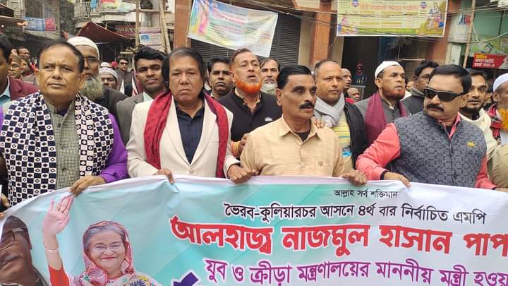 আজ শুক্রবার (১২ জানুয়ারি)পাপনের মন্ত্রীত্ব পাওয়ার খুশিতে মিছিল ও মিষ্টি বিতরণ করেছে ভৈরব আওয়ামী লীগ নেতৃবৃন্দ।