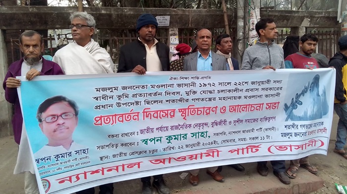 সভাপতির বক্তব্যে স্বপন কুমার সাহা বলেন, মজলুম জননেতা মওলানা ভাসানী মুক্তিযুদ্ধ চলাকালীন প্রভাস সরকারের প্রধান উপদেষ্টা ছিলেন। তাকে পাঠ্যপুস্তকে স্বাধীনতার উপদেষ্টা হিসেবে অন্তর্ভূক্ত করার জন্য সরকারের প্রতি দাবি জানান এবং সাংবিধানিকভাবে প্রধান উপদেষ্টা হিসেবে অন্তর্ভূক্ত করার জন্য মাননীয় প্রধানমন্ত্রীর দৃষ্টি আকর্ষণ করেন। মওলানা ভাসানী রাজনৈতিকভাবে তিনি সকলের কাছে পরম পুজনীয়।