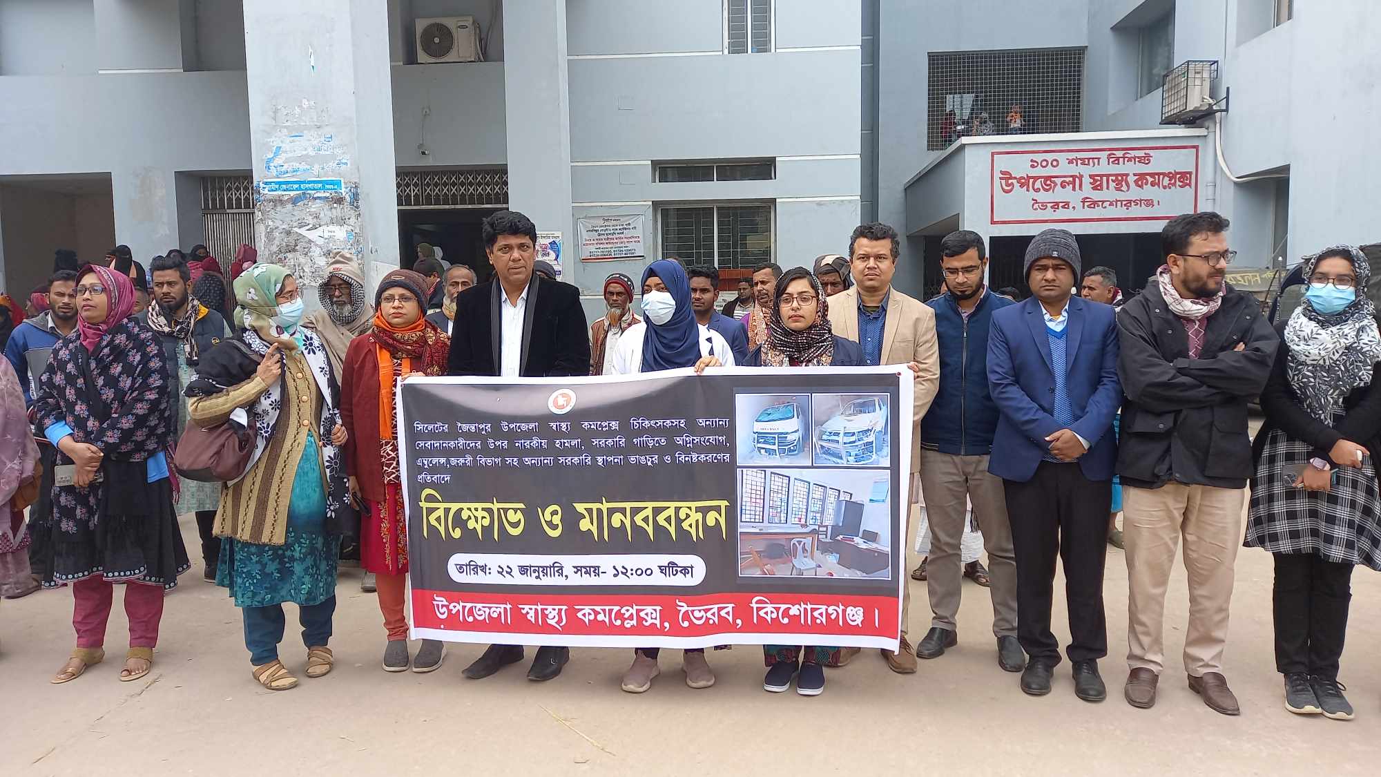 ভৈরব (কিশোরগঞ্জ) প্রতিনিধি: সিলেটের জৈন্তাপুর উপজেলা স্বাস্থ্য কমপ্লেক্স চিকিৎসকসহ অন্যান্য সেবাদানকারীদের উপর নারকীয় হামলার প্রতিবাদের বিক্ষোভ ও মানববন্ধন করা হয়েছে। আজ সোমবার (২২ জানুয়ারি) বেলা ১২ টায় উপজেলা স্বাস্থ্য কমপ্লেক্স চত্বরে স্বাস্থ্য কমপ্লেক্সের পরিবার ও পরিকল্পনা কর্মকর্তা ডা. বুলবুল আহমেদ এর নেতৃত্বে এই মানববন্ধন ও বিক্ষোভ অনুষ্ঠিত হয়।