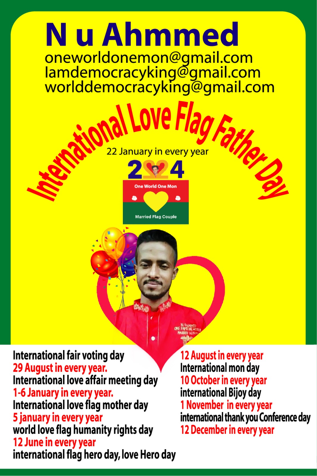 গণতন্ত্রের রাজা এন ইউ আহম্মেদ বলেন, আমার বিয়ের দিবস ঘোষণা করছি, world married love flag couple day, দীর্ঘ বছর সামাজিক যোগাযোগ মাধ্যমে ইমেইলে প্রেমের সম্পর্ক মাধ্যমে আমি আগামী বছর বিয়ে করবো তখন আমার বিয়ের দিবসের তারিখ পরবর্তীতে প্রকাশ করা হবে।।।