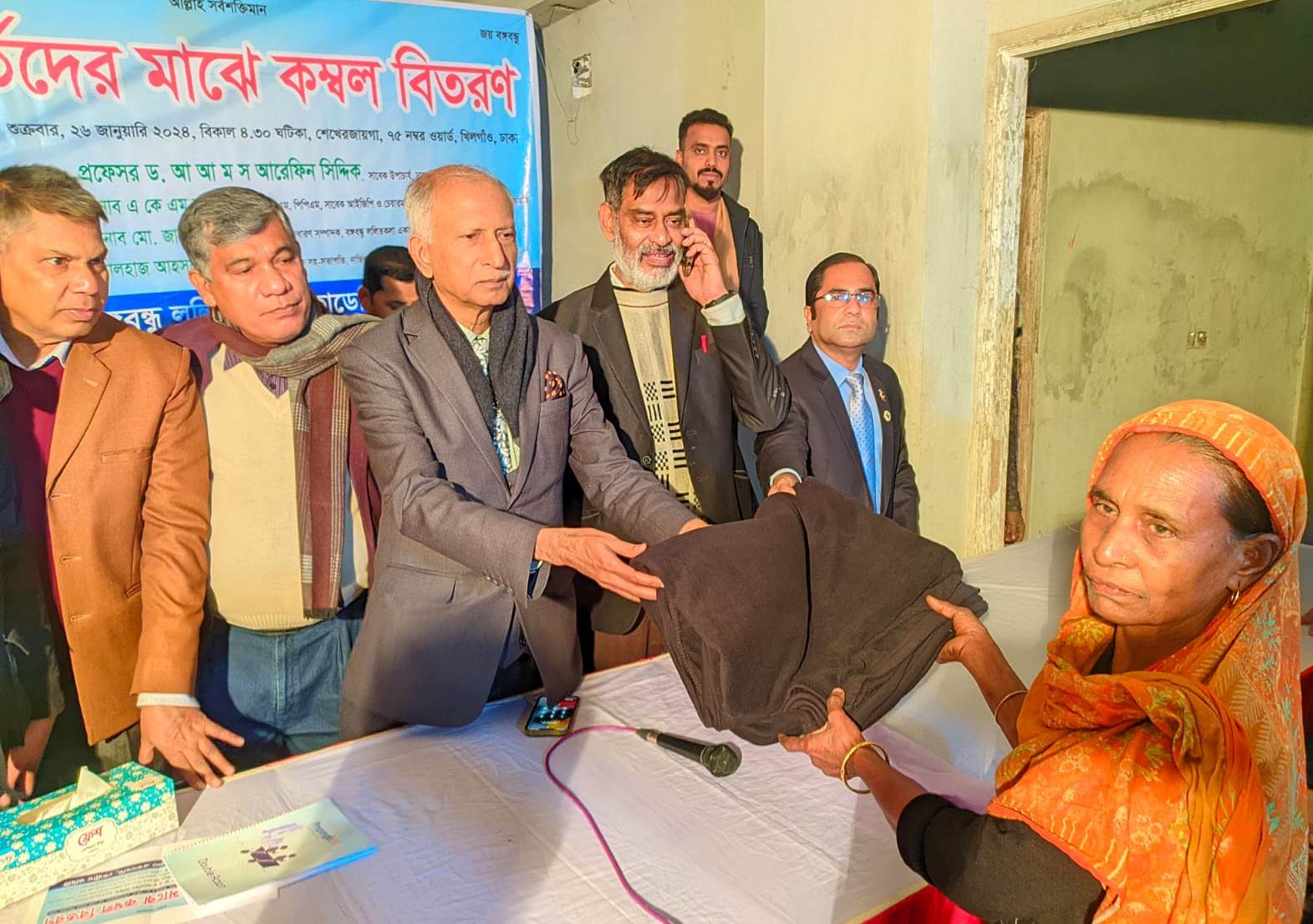 নিজস্ব প্রতিবেদকঃ বঙ্গবন্ধু ললিতকলা একাডেমির উদ্যোগে গত ২৬ জানুয়ারি ২০২৪ তারিখে ঢাকার খিলগাঁও থানাধীন ৭৫ নম্বর ওয়ার্ডের শেখেরজায়গায় দুস্থ-শীতার্তদের মাঝে কম্বল বিতরণ করেন অনুষ্ঠানের প্রধান অতিথি ঢাকা বিশ্ববিদ্যালয়ের সাবেক উপাচার্য প্রফেসর ড. আ আ ম স আরেফিন সিদ্দিক।