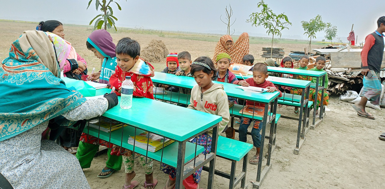 নিজস্ব প্রতিবেদক: সিরাজগঞ্জের চৌহালী উপজেলার ‘পয়লা সরকারি প্রাথমিক বিদ্যালয়’ ভবনটি প্রায় তিন বছর আগে যমুনা নদীর ভাঙনে বিলীন হয়েছে । নতুন ভবন নির্মাণের জন্য প্রকল্পও বরাদ্দ দেওয়া হয়েছে। কিন্তু নির্ধারিত সময়ে ভবন তৈরি না হওয়ায় খোলা আকাশের নিচে চলছে কোমলমতি শিক্ষার্থীদের পাঠদান কার্যক্রম। এবারের হাড় কাঁপানো কনকনে শীতের মধ্যেও শিক্ষার্থীদের খোলা আকাশের নিচে ক্লাস করতে হচ্ছে। এতে শিশুরা আক্রান্ত হচ্ছে বিভিন্ন ঠান্ডাজনিত রোগে।