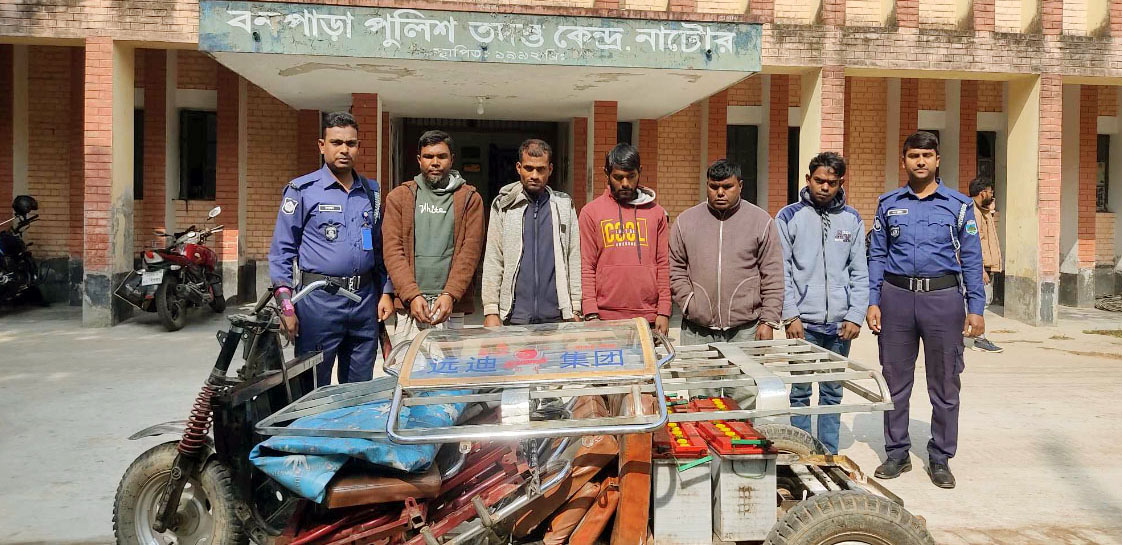 গোপন সংবাদের ভিত্তিতে নাটোরের তেবাড়িয়া, লালপুর ও গোপালপুর থেকে ইজিবাইকের খন্ডিত অংশসহ আন্তঃজেলা চোর চক্রের ৫ সদস্যকে আটক করা হয়। তারা জেলার বিভিন্ন জায়গা থেকে অটোভ্যান, ইজিবাইক চুরি করতো।