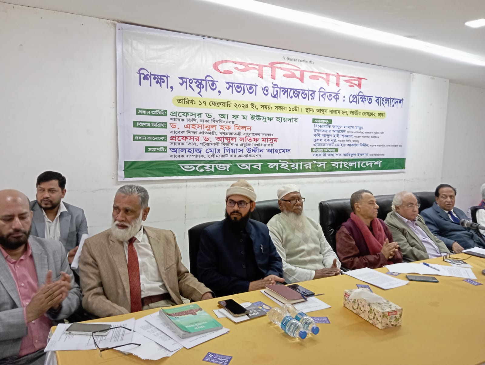 সুপ্রীম কোর্ট বার এসোসিয়েশন সাবেক সম্পাদক আলহাজ্ব গিয়াস উদ্দীন আহমেদ এর সভাপতিত্বে ও ভয়েস অব লইয়া’স বাংলাদেশ এর চীফ কো-অর্ডিনেটর এডভোকেট আশরাফ-উজ-জামান এর সার্বিক তত্বাবধায়নে ভয়েস অব লইয়া’স বাংলাদেশ এর কো-অর্ডিনেটর বাংলাদেশ সুপ্রীম কোর্টের এডভোকেট দেলোয়ার হোসেনের সঞ্চালনায় অনুষ্ঠানে প্রধান অতিথি ছিলেন ঢাকা বিশ্ববিদ্যালয়ের সাবেক ভিসি প্রফেসর ড. আ ফ ম ইউসুফ হায়দার।