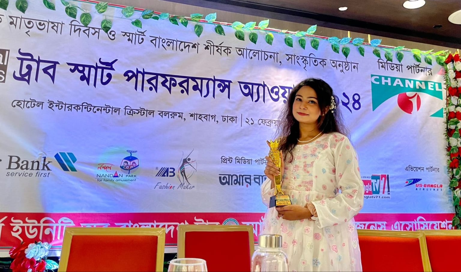 নিজস্ব প্রতিবেদকঃ তরুণ প্রজন্মের জনপ্রিয় কণ্ঠশিল্পী, চ্যানেল আই ক্ষুদে গানরাজ চ্যাম্পিয়ন এবং চ্যানেল আই মিউজিক অ্যাওয়ার্ড বিজয়ী পুষ্পিতা পেলেন ট্রাব স্মার্ট পারফরম্যান্স অ্যাওয়ার্ড-২০২৪। সম্প্রতি ঢাকার হোটেল ইন্টারকন্টিনেন্টাল ক্রিস্টাল বলরুমে অনুষ্ঠিত টেলিভিশন রিপোর্টার্স ইউনিটি অব বাংলাদেশ- ট্রাব এবং স্মার্ট বাংলাদেশ বিজনেস এসোসিয়েশন কর্তৃক আয়োজিত ট্রাব স্মার্ট পারফরম্যান্স অ্যাওয়ার্ড-২০২৪ অনুষ্ঠানে এই অ্যাওয়ার্ড প্রদান করা হয়।