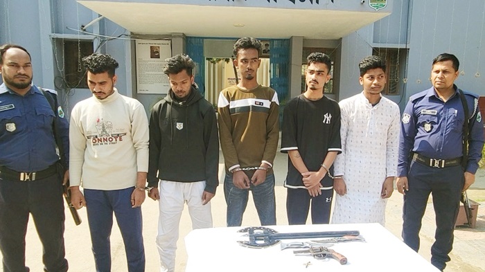 ওসি রওশন আলী বলেন, গোপন সংবাদের ভিত্তিতে বাংলাবাজার পলেথিন মোড় এলাকায় অভিযান চালিয়ে তাদের গ্রেফতার করা হয়েছে। তাদের কাছ থেকে একটি বিদেশী রিভলবার, দুই রাউন্ড গুলি, হাত কুড়াল, দুইটা টিপ চাকু জব্দ করা হয়।