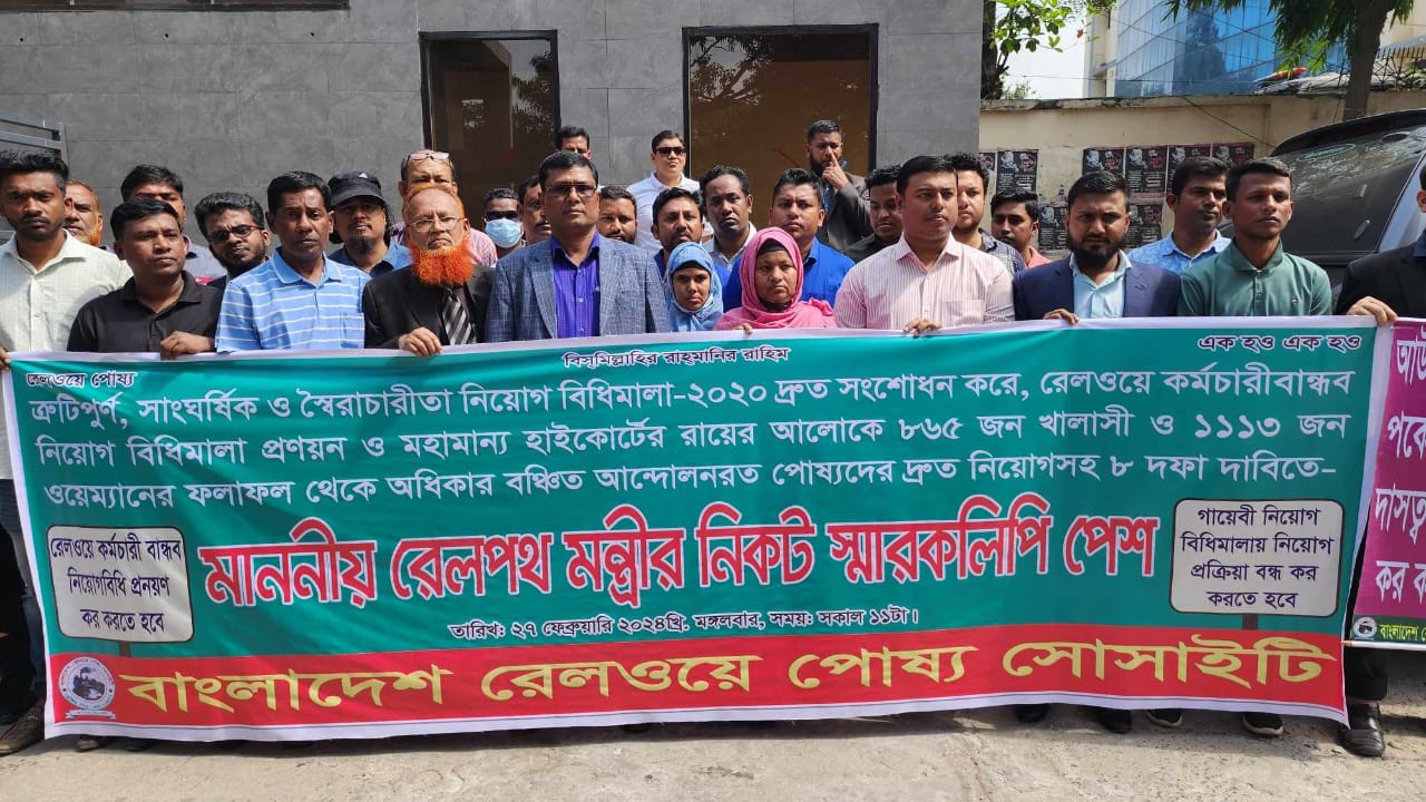 এর আগে স্মারকলিপি পেশ কর্মসূচিতে সভাপতির বক্তব্যে বাংলাদেশ রেলওয়ে পোষ্য সোসাইটির কেন্দ্রীয় সভাপতি মোঃ মনিরুজ্জামান মনির বলেন, মাননীয় মন্ত্রী আপনি রেলওয়ের চালিকা শক্তি, দায়িত্বশীল ও প্রধান কর্ণধার এবং সকলের অভিভাবক। আপনি মন্ত্রী হিসেবে দায়িত্ব গ্রহণের পর বাংলাদেশ রেলওয়ের কর্মকর্তা, কর্মচারী ও পোষ্যদের মনে নতুন করে আশার সঞ্চার হয়েছে। “রেলওয়ে ক্যাডার বহির্ভূত কর্মচারী নিয়োগ বিধিমালা—২০২০” সম্পূর্ণ ত্রুটিপূর্ণ, সাংঘর্ষিক ও স্বৈরাচারিতামূলক। এই নিয়োগ বিধিমালা মূলত রেলওয়ের পোষ্য এবং শ্রমিক—কর্মচারীদের অধিকার বঞ্চিত করার এক ঐতিহাসিক দলিল। ষড়যন্ত্রমূলক এই নিয়োগ বিধিমালা রেলওয়ে পোষ্য এবং শ্রমিক—কর্মচারীরা নীতিগত ভাবে মেনে না নিয়ে বাংলাদেশ রেলওয়ের সকল ট্রেড ইউনিয়ন ও বাংলাদেশ রেলওয়ে পোষ্য সোসাইটি আন্দোলন—সংগ্রাম গড়ে তোলে। গত ২১ ডিসেম্বর ২০২১ তারিখে বাংলাদেশ রেলওয়ে পোষ্য সোসাইটি কর্তৃক মাননীয় প্রধানমন্ত্রী বরাবরে স্মারকলিপি প্রদানের প্রেক্ষিতে ২৭ ডিসেম্বর ২০২১ তারিখে বাংলাদেশ রেলওয়ের মহাপরিচালককে আহবায়ক করে ১৮ সদস্য বিশিষ্ট নিয়োগ বিধিমালা ২০২০ হালনাগাদ/সংশোধন করণের জন্য কমিটি গঠিত হয়। কিন্তু গত ২৬ মাসেও কমিটি কর্তৃক নিয়োগ বিধিমালা ২০২০ সংশোধন না করেই গায়েবী বিধিমালায় সম্পূর্ণ অবৈধভাবে জনবল নিয়োগ কার্যক্রমের মাধ্যমে রেলওয়ে পোষ্যদের অধিকার বঞ্চিত করা হচ্ছে এবং আউটসোর্সিং এর নামে প্রায় ৮ হাজার দক্ষ টিএলআর শ্রমিককে তাদের অধিকার থেকে বঞ্চিত করা হয়েছে। নিয়োগ বিধিমালা ২০২০ অনতিবিলম্বে সংশোধন করে রেলওয়ে কর্মচারী বান্ধব নিয়োগ বিধিমালা প্রণয়নে “রেলওয়ে ক্যাডার বহির্ভূত কর্মচারী নিয়োগ বিধিমালা—২০২০” এর বিভিন্ন অংশগুলো সংশোধনের জন্য বাংলাদেশ রেলওয়ে পোষ্য সোসাইটির প্রস্তাবনা এবং মহামান্য হাইকোর্টের রায়ের আলোকে ৮৬৫ জন খালাসীর ফলাফল থেকে অধিকার বঞ্চিত রেলওয়ে পোষ্যদের দ্রুত নিয়োগ, নিয়োগবিধি ১৯৮৫ আলোকে পোষ্যর সংজ্ঞা, নিয়োগ পদ্ধতি, পদোন্নতির মাধ্যমে নিয়োগ, সরাসরি নিয়োগ, শিক্ষাগত যোগ্যতা, ব্লক পোস্ট প্রত্যাহার, রেলওয়ে নিয়োগ ব্যুরো পূর্বাঞ্চল ও পশ্চিমাঞ্চল মহাব্যবস্থাপক কতৃর্ক ৩য় ও ৪র্থ শ্রেণীর কর্মচারী নিয়োগের পূর্ণ ক্ষমতা প্রদানসহ ৮ দফা দাবিতে আপনার বরাবরে স্মারকলিপি পেশ করছি।