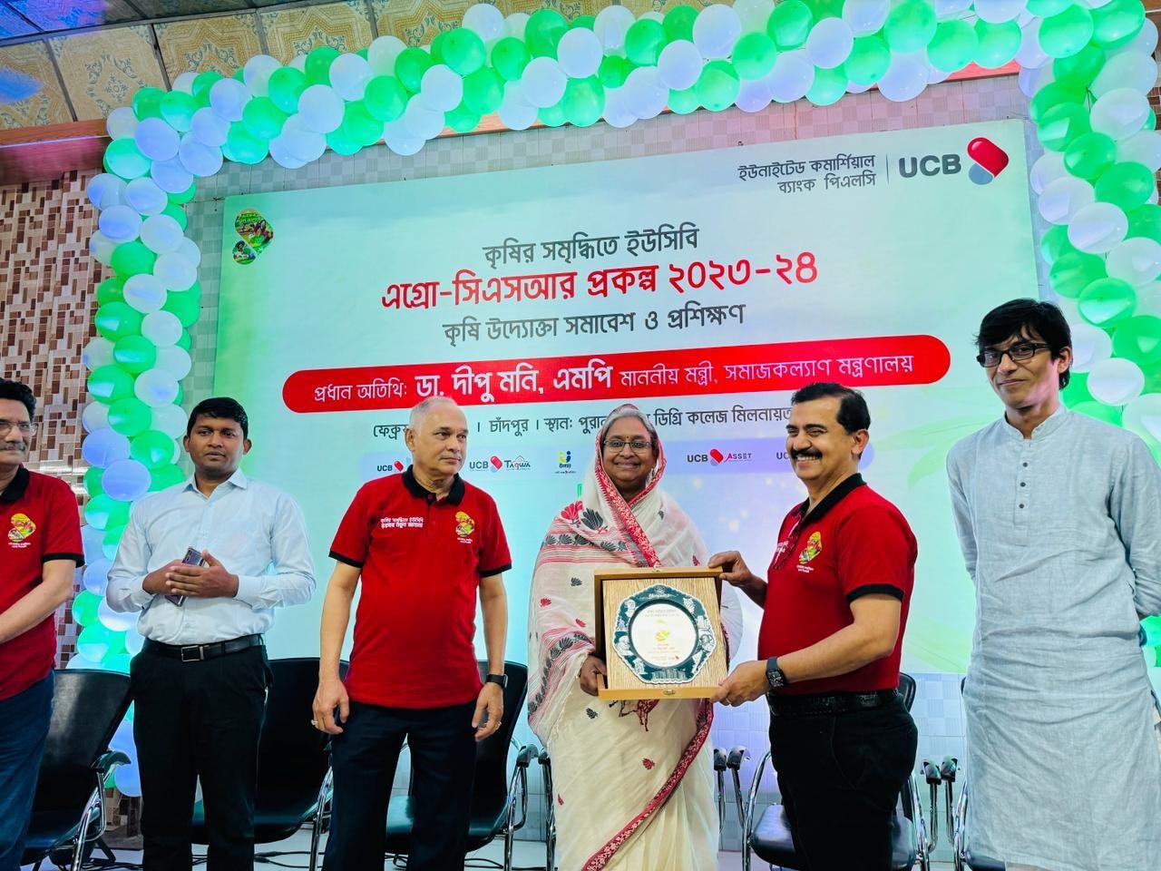 নিজস্ব প্রতিবেদকঃ ইউনাইটেড কমার্শিয়াল ব্যাংক (ইউসিবি) পিএলসির ‘ভরসার নতুন জানালা’ শীর্ষক কৃষি সহায়তামূলক প্রকল্পের অধীন চাঁদপুরে কৃষি উদ্যোক্তা সমাবেশ ও প্রশিক্ষণ অনুষ্ঠিত হয়েছে। চাঁদপুর পুরানবাজার ডিগ্রি কলেজ মিলনায়তনে চাঁদপুর জেলার ৮টি উপজেলা থেকে প্রায় আড়াইশ কৃষি উদ্যোক্তা এই আয়োজনে অংশগ্রহণ করেন। অনুষ্ঠানে প্রধান অতিথি হিসেবে উপস্থিত ছিলেন সমাজকল্যাণমন্ত্রী ডা. দীপু মনি, এমপি এবং সভাপতিত্ব করেন উপায়-ইউসিবির উপদেষ্টা জিষ্ণু রায় চৌধুরী।