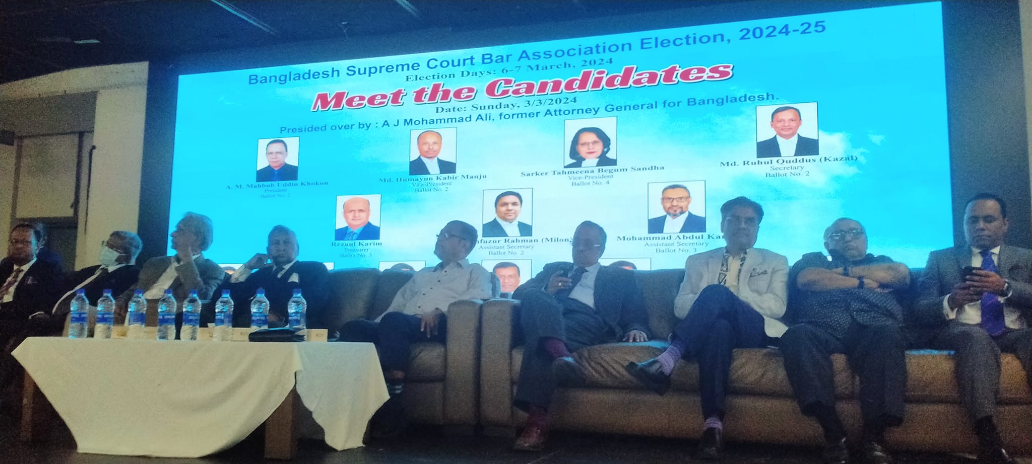 নিজস্ব প্রতিবেদকঃ ৩রা মার্চ-২৪, রোববার, বাংলাদেশ সুপ্রীম কোর্ট বারের নির্বাচনে গণতন্ত্রের স্বপক্ষ ও সকল প্রকার জুলুম-নির্যাতন বিরোধী এবং দল মত নির্বিশেষে আইনজীবীদের কল্যাণের প্যানেলে "খোকন-কাজল" পরিষদের প্যানেল পরিচিতি ঐতিহ্যবাহী ঢাকা ক্লাবে অনুষ্ঠিত হয়।