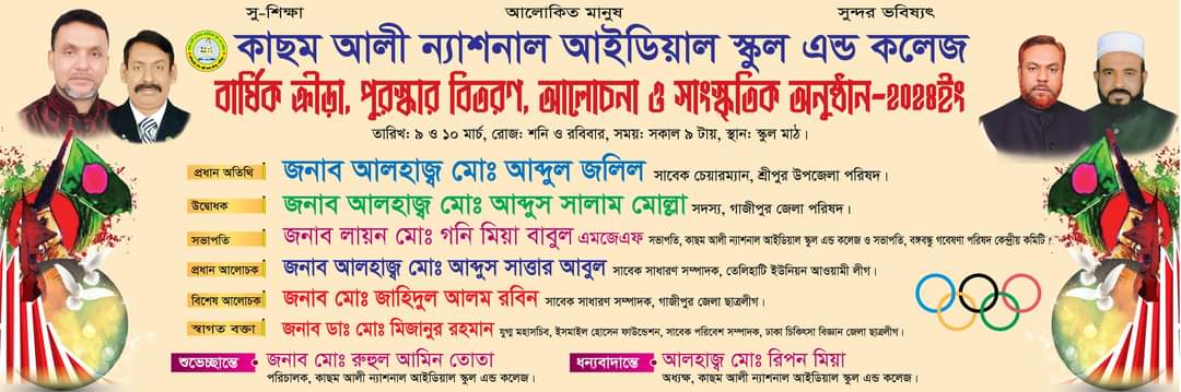 নিজস্ব প্রতিবেদকঃ গাজীপুর জেলার শ্রীপুরের কাছম আলী ন্যাশনাল আইডিয়াল স্কুল এন্ড কলেজের বার্ষিক ক্রীড়া প্রতিযোগিতা, সাংস্কৃতিক অনুষ্ঠান, কৃতি শিক্ষার্থীদের সংবর্ধনা ও পুরস্কার বিতরণ ২০২৪ আগামী ১০ মার্চ, রবিবার সকাল ৯টা থেকে দিনব্যাপি স্কুল প্রাঙ্গণে অনুষ্ঠিত হবে।