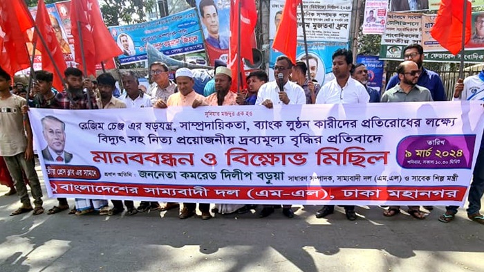নিজস্ব প্রতিবেদকঃ বাংলাদেশের সাম্যবাদী দল (এমএল)’র ঢাকা মহানগর কমিটি আয়োজিত অদ্য ৯ মার্চ ২০২৪, শনিবার সকাল ১১টায় জাতীয় প্রেসক্লাবের সামনে বিদ্যুৎসহ দ্রব্যমূল্য উর্ধ্বগতির প্রতিবাদে মানববন্ধন ও বিক্ষোভ মিছিল ও অনুষ্ঠিত হয়। সভায় সভাপতিত্ব করেন ঢাকা মহানগর কমিটির আহ্বায়ক ও কেন্দ্রীয় কমিটির সদস্য সাইমুম হক।