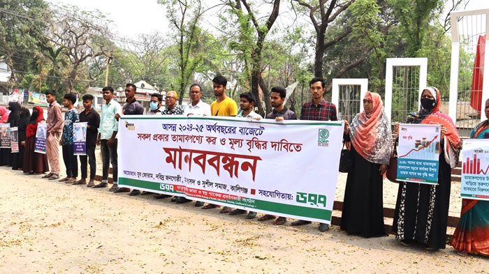 ডেভেলপমেন্ট অর্গানাইজেশন অব দি রুরাল পুয়র (ডর্প) এর সহযোগিতায় ডর্প যুব ফোরাম, মা-সংসদ ও স্থানীয় সুশীল সমাজ আয়োজিত মানববন্ধনে বক্তারা আসন্ন ২০২৪-২৫ অর্থবছরের বাজেটে তামাক-কর ও দাম বৃদ্ধির জন্য তিনটি সুনির্দিষ্ট প্রস্তাব উত্থাপন করেন। এগুলো হল –