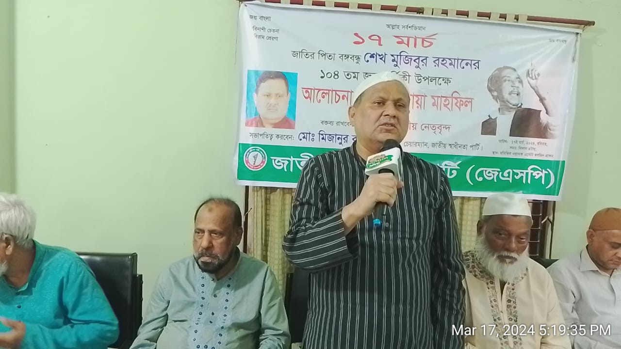 সভায় সভাপতির বক্তব্যে জাতীয় স্বাধীনতা পার্টির চেয়ারম্যান মিজানুর রহমান মিজু বলেন, স্বাধীন বাংলাদেশের স্থপতি, বাঙালি জাতির অবিসংবাদিত এই নেতা ১৯২০ সালের এ দিনে গোপালগঞ্জ জেলার টুঙ্গিপাড়ার এক সম্ভ্রান্ত মুসলিম পরিবারে জন্মগ্রহণ করেন। কলকাতার ইসলামিয়া কলেজে অধ্যয়নকালে তিনি সক্রিয়ভাবে রাজনীতিতে জড়িয়ে পড়েন। কারাগারে থেকে এবং কারাগারের বাইরেও বঙ্গবন্ধু ভাষা আন্দোলনে নেতৃত্ব দিয়েছিলেন। ১৯৫২ সালের ২১ ফেব্রুয়ারি যখন ভাষা আন্দোলনের নেতাকর্মীদের হত্যা করা হয়, তখন বঙ্গবন্ধু কারাগারে অনশন করেছিলেন।