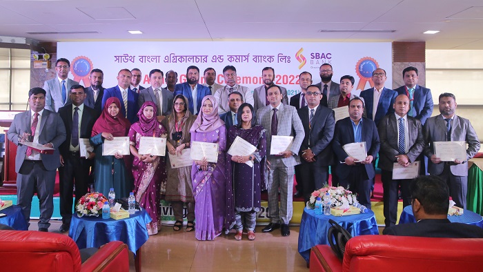 সাউথ বাংলা এগ্রিকালচার অ্যান্ড কমার্স ব্যাংক তাদের সেরা কর্মকর্তাদের পুরস্কৃত করেছে। সম্প্রতি রাজধানীর একটি হোটেলে আয়োজিত এক অনুষ্ঠানে কর্মকর্তাদের হাতে ক্রেস্ট, সার্টিফিকেট ও নগদ অর্থ তুলে দেন ব্যাংকের ব্যবস্থাপনা পরিচালক ও প্রধান নির্বাহী মোসলেহ উদ্দীন আহমেদ।