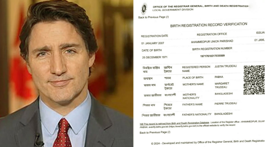 উল্লেখ্য, কানাডার প্রধানমন্ত্রী জাস্টিন ট্রুডো পেয়েছেন বাংলাদেশী জন্মসনদ। সেই জন্মসনদের কাগজ বলছে তিনি জন্মসূত্রে পাবনা জেলার নাগরিক। পাবনার সুজানগর উপজেলার আহম্মদপুর ইউনিয়ন পরিষদ থেকে তার নামে ইস্যু করা ভুয়া জন্ম নিবন্ধন সনদ থেকে এই তথ্য বৃহস্পতিবার জানাজানি হয়। তারপর থেকে চাঞ্চল্যের সৃষ্টি হয়েছে।