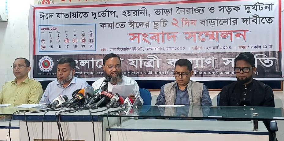 ঈদযাত্রা নিরাপদ ও ভোগান্তিমুক্ত করতে আজ সকালে ঢাকা রিপোর্টার্স ইউনিটিতে আয়োজিত এক সংবাদ সম্মেলনে বাংলাদেশ যাত্রী কল্যাণ সমিতির মহাসচিব মো. মোজাম্মেল হক চৌধুরী এ দাবি জানান।