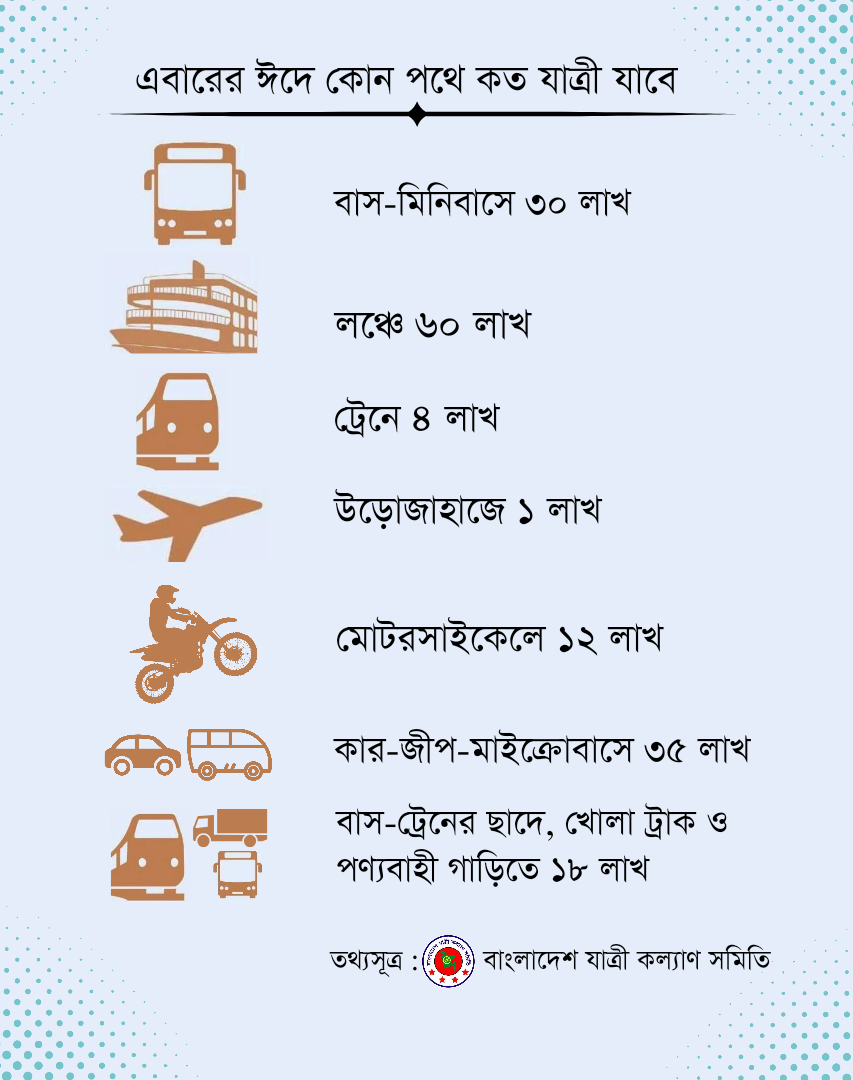 বাংলাদেশ যাত্রী কল্যাণ সমিতির পর্যবেক্ষণ বলছে, এবারের ঈদে ঢাকা থেকে ১ কোটি, গাজীপুর থেকে ৪০ লাখ, নারায়ণগঞ্জ থেকে ১২ লাখসহ ঢাকা ও আশেপাশের জেলা থেকে ১কোটি ৬০ লাখ মানুষ দেশের বিভিন্ন জেলায় যাতায়াত করবে। এসব যাত্রীদের ঈদের আগের চারদিনে বাস-মিনিবাসে ৩০ লাখ, ট্রেনে ০৪ লাখ, প্রাইভেটকার,জিপ ও মাইক্রোবাসে ৩৫ লাখ, মোটরসাইকেলে ১২ লাখ, লঞ্চে ৬০ লাখ, উড়োজাহাজে প্রায় ১ লাখ যাত্রীর যাতায়াত হতে পারে। গণপরিবহন সংকট ও অতিরিক্ত ভাড়া আদায়ের নৈরাজ্যর কারণে বাসের ছাদে, ট্রেনের ছাদে এবং খোলা ট্রাক ও পণ্যবাহী পরিবহনে ১৮ লাখ যাত্রীর যাতায়াত হতে পারে। এছাড়াও আন্তঃজেলা যাতায়াত করবে প্রায় ৪ থেকে ৫ কোটি যাত্রী। এতে আগামী ০৫ এপ্রিল থেকে ১৪ এপ্রিল পর্যন্ত ঈদবাজার, গ্রামের বাড়ি যাতায়াতসহ নানা কারণে দেশের বিভিন্ন শ্রেণির পরিববহনে বাড়তি প্রায় ৬০ কোটি ট্রিপ যাত্রীর যাতায়াত হতে পারে।