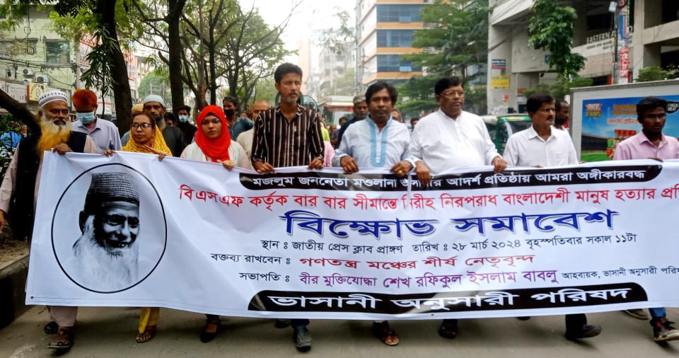 নিজস্ব প্রতিবেদকঃ ২৮ মার্চ বৃহস্পতিবার সকাল ১১টায় জাতীয় প্রেসক্লাবের সামনে ভারতীয় সীমান্তে বিএসএফ কর্তৃক বার বার বাংলাদেশী নিরীহ, নিরাপরাধ মানুষ হত্যার প্রতিবাদে ভাসানী অনুসারী পরিষদের উদ্যোগে এক বিক্ষোভ সমাবেশ অনুষ্ঠিত হয়।