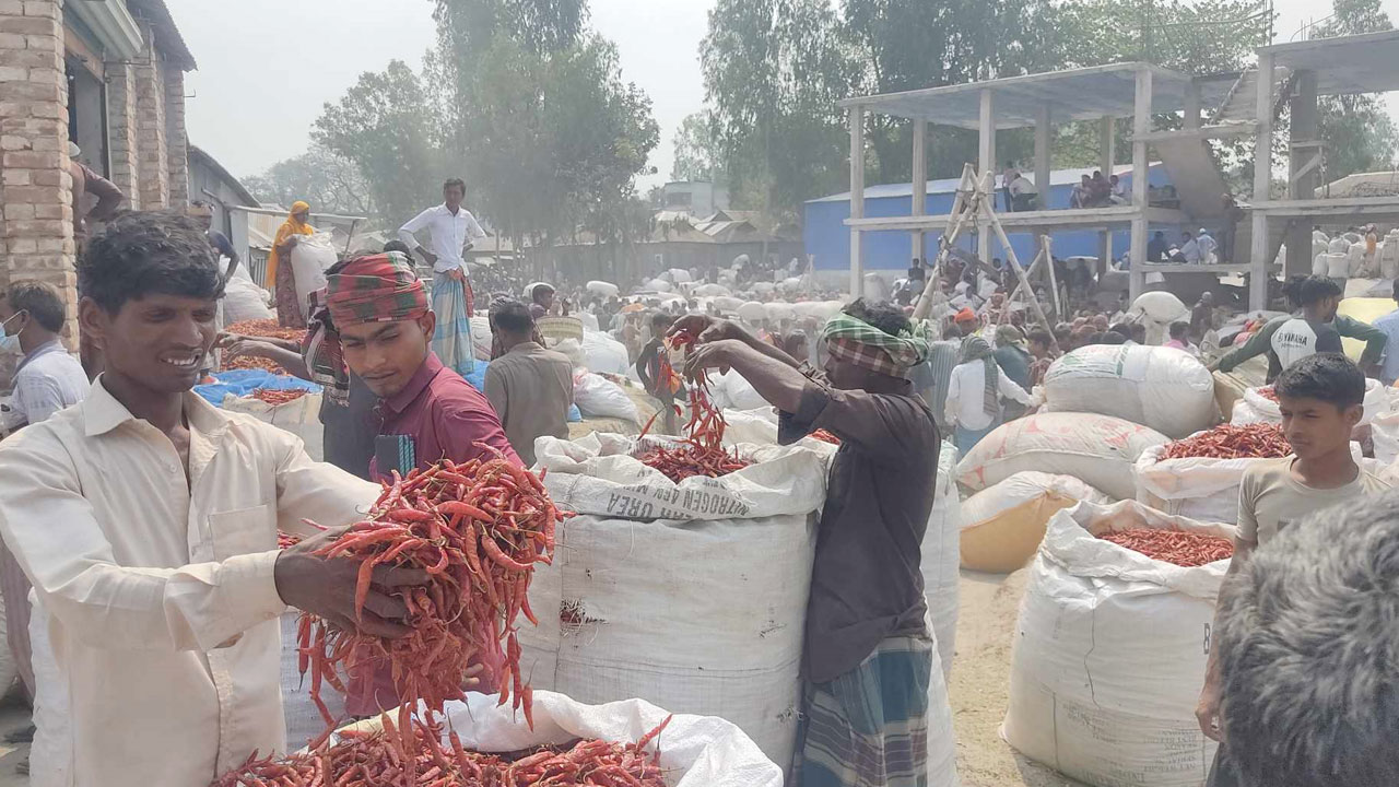 এই হাটে মরিচ বিক্রি করতে আসেন প্রায় হাজার খানেক কৃষক।