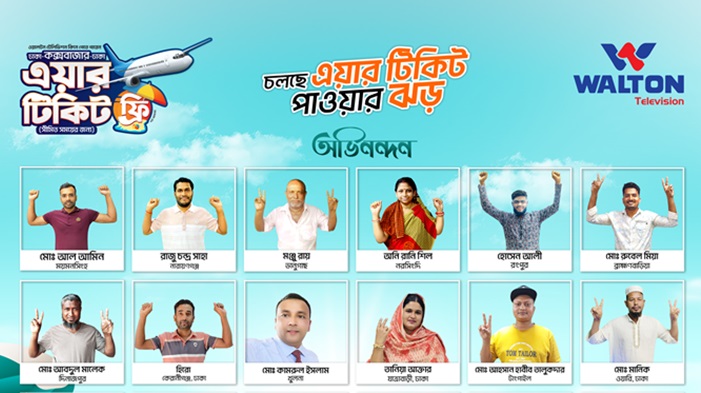 ওয়ালটন টিভির ব্র্যান্ড ম্যানেজার খন্দকার আশিকুল হাসান জানান, ঈদ উৎসবে দেশের যেকোনো ওয়ালটন প্লাজা, পরিবেশক শোরুম কিম্বা অনলাইন সেলস প্লাটফর্ম ‘ই-প্লাজা’ থেকে বেসিক এলইডি বা স্মার্ট টিভি কিনে ক্রেতারা ঢাকা-কক্সবাজার-ঢাকা’র এয়ার টিকিট ফ্রি পাওয়ার সুযোগ পাচ্ছেন। চলতি মাসের ১ তারিখ থেকে চাঁদরাত পর্যন্ত অর্থাৎ ঈদুল ফিতরের আগের দিন পর্যন্ত এই সুবিধা পাবেন ক্রেতারা। এরইমধ্যে ঢাকা, গাজীপুর, কালিয়াকৈর, মুন্সীগঞ্জ, নেত্রকোনা, ময়মনসিংহ, টাঙ্গাইল, জামালপুর ও শেরপুরে ৩৫ জন গ্রাহক ওয়ালটন টিভি কিনে ঢাকা-কক্সবাজার-ঢাকা’র এয়ার টিকিট ফ্রি পেয়েছেন। আগামী কয়েকদিনে আরো অসংখ্য ক্রেতা এই সুবিধা পাবেন বলে আশা করছি।