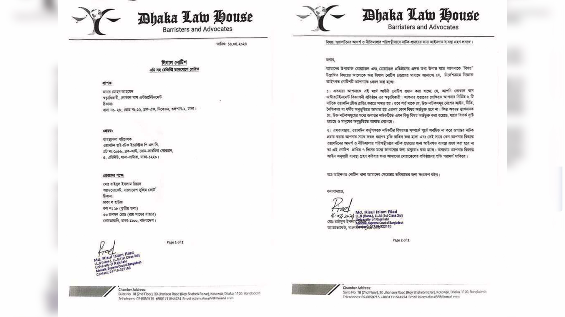 সেই সঙ্গে কেন আদর্শ ও নীতিমালার পরিপন্থিভাবে নাটক প্রচারের জন্য আইনগত ব্যবস্থা গ্রহণ করা হবে না, তা নোটিশ প্রাপ্তির ৭ দিনের মধ্যে জানানোর জন্য বলা হয়েছে।