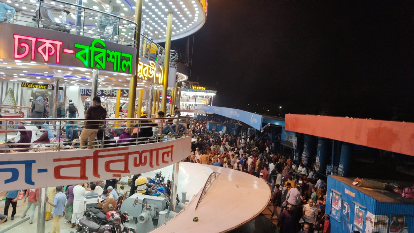 এদিকে ঈদকে ঘিরে দেশের দ্বিতীয় বৃহত্বম বরিশাল নদী বন্দরে অতীতের চীরচেনা দৃশ্য না থাকলেও ঈদ পরবর্তি সময়ে যাত্রীদের পদভারে মুখরিত বিগত কয়েকটি দিন। বরিশাল-ঢাকা নৌপথে রুট পারমিটধারী প্রায় ২৯টি যাত্রীবাহী নৌযানের অন্তত ১০টি ইতোমধ্যে হারিয়ে গেলেও অবশিষ্টগুলো কোনমতে অস্তিত্ব টিকিয়ে রেখেছে। রোববারে বরিশাল নদী বন্দর থেকে ১২টি নৌযান যাত্রী বোঝাই করে ঢাকার উদ্দেশ্যে ছেড়ে যাবার পরে সোম ও মঙ্গলবারেও প্রায় একই পরিস্থিতি অব্যাহত ছিল। এমনকি বেশীরভাগ নৌযানই ধারন ক্ষমতার দ্বিগুনেরও বেশী যাত্রী বহন করলেও এবার নৌপথে ভাড়া বাড়ায়নি মালিক পক্ষ।। নিকটজনের সাথে ঈদের আনন্দ ভাগাভাগি করতে ঘরে ফেরা শ্রমজীবী ও কর্মজীবী মানুষ আগামী শণিবার পর্যন্তই বরিশাল ও সন্নিহিত এলাকা থেকে কর্মস্থলে ফিরবেন বলে আশা করছেন সড়ক ও নৌ পরিবহনের সাথে সংশ্লিষ্ট জনেরা। দুটি বাস টার্মিনাল ছাড়াও বরিশাল নদী বন্দরেও গত কয়েকদিন পা ফেলার স্থান নেই।