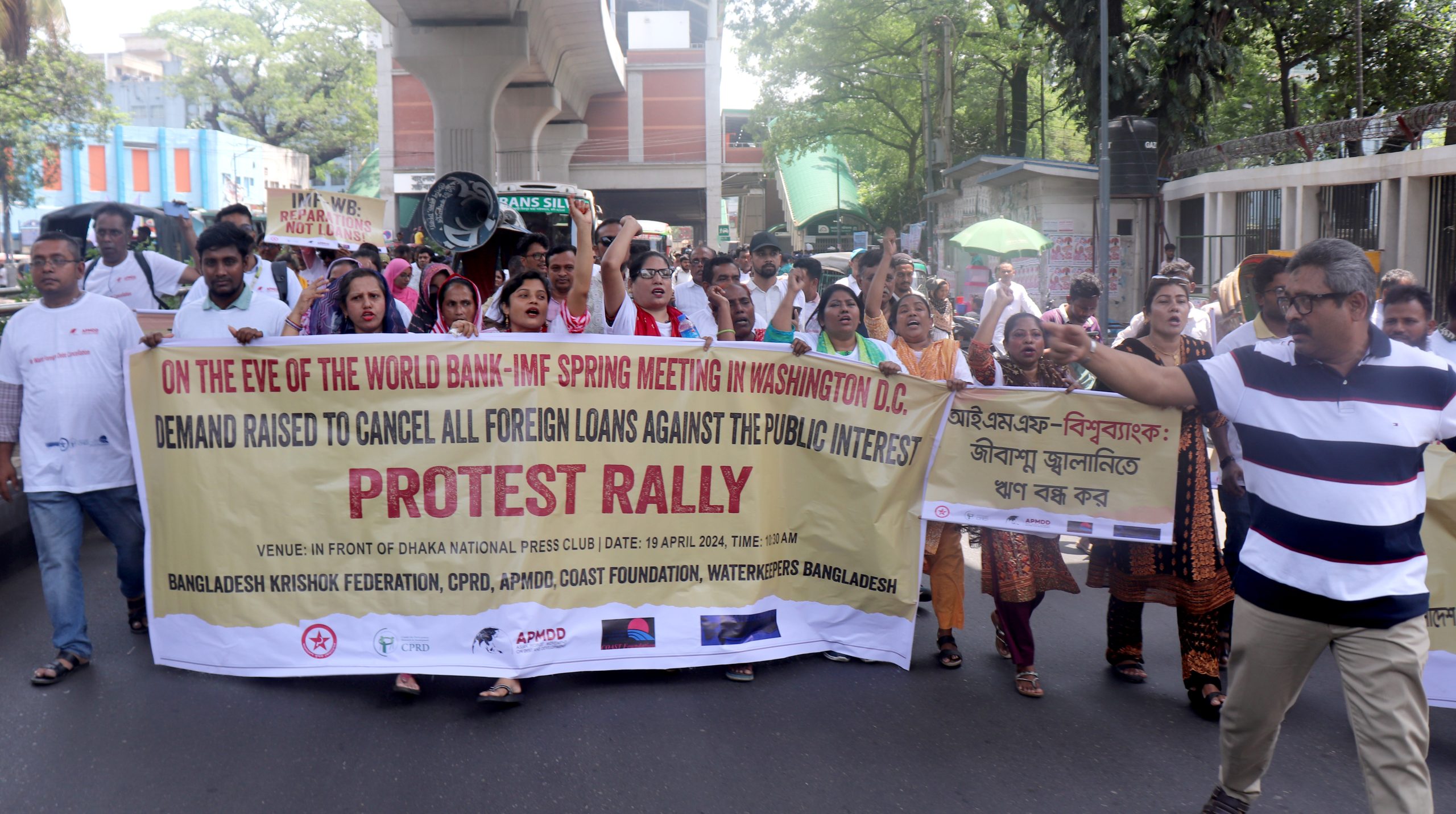 নিজস্ব প্রতিবেদকঃ আজ ১৯ এপ্রিল ২০২৪ সকাল ১০:৩০ টায় ঢাকা জাতীয় প্রেসক্লাবের সামনে ঋণ ও উন্নয়ন বিষয়ক এশীয় গণআন্দোলন(এপিএমডিডি), বাংলাদেশ কৃষক ফেডারেশন, কোস্ট ফাউন্ডেশন, ওয়াটারকিপার্স বাংলাদেশ ও সিপিআরডি’র যৌথ উদ্যোগে বিশ্বব্যাংক—আইএমএফের ওয়াশিংটন ডিসিতে বসন্তকালীন বৈঠকের প্রাক্কালে জনস্বার্থ বিরোধী সকল বৈদেশিক ঋণ  বাতিলের দাবীতে এক বিক্ষোভ সমাবেশ অনুষ্ঠিত হয়।