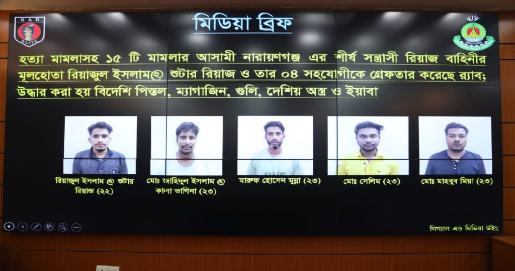শাকিল আহম্মেদ,নারায়ণগঞ্জ জেলা প্রতিনিধি: নারায়ণগঞ্জের রূপগঞ্জ ও সোনারগাঁও উপজেলা থেকে ১৫টি মামলার আসামি শীর্ষ সন্ত্রাসী রিয়াজুল ইসলাম ও তার চার সহযোগীকে গ্রেপ্তার করেছে র্যাপিড অ্যাকশন ব্যাটালিয়ন (র্যাব) সদস্যরা।