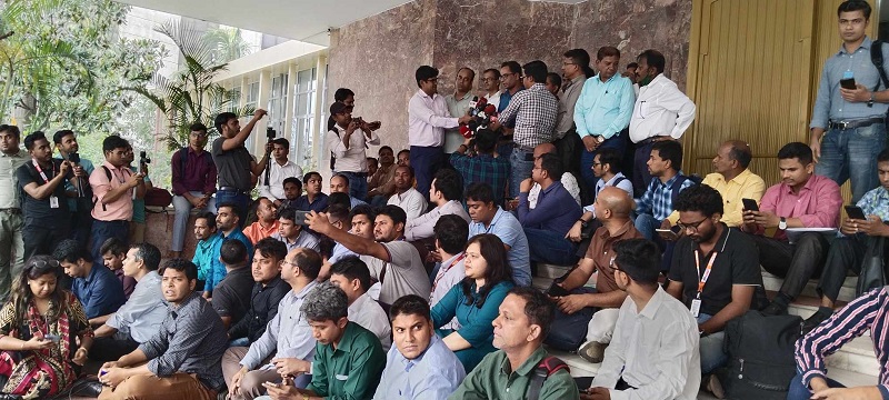 সংবাদ সম্মেলন শুরুর আগে সাংবাদিকরা জানতে চান গণমাধ্যম কর্মীদের তথ্য সংগ্রহে প্রবেশ ইস্যুর বিষয়ে সুরাহা হয়েছে কিনা। সন্তোষজনক জবাব না পেয়ে সংবাদ সম্মেলনটি বর্জনের ঘোষণা দেয় অর্থনৈতিক সাংবাদিকরা।