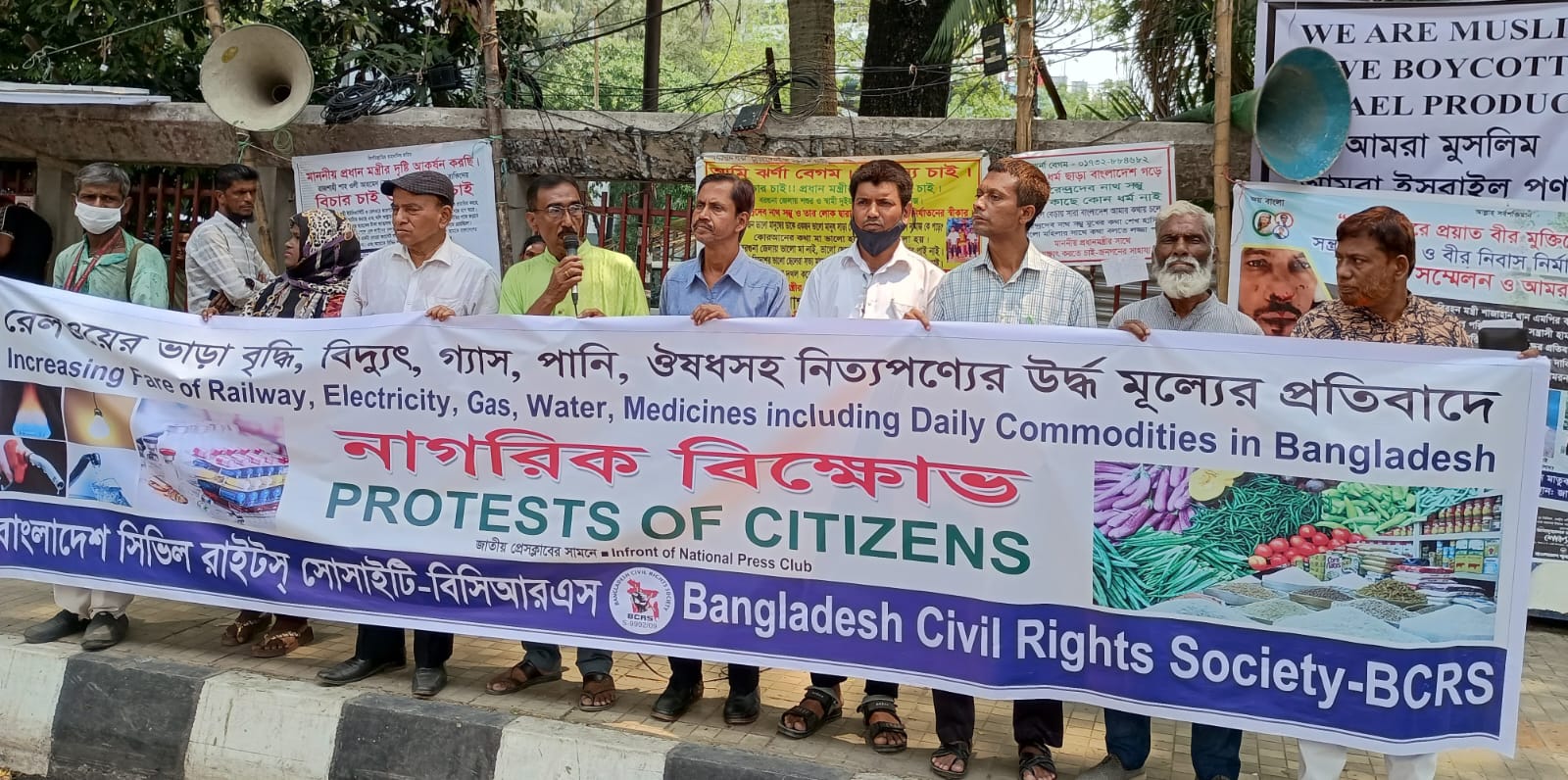 নিজস্ব প্রতিবেদকঃ আজ ৯ মে বেলা ১২টায় জাতীয় প্রেসক্লাবের সামনে জাতীয় মানবাধিকার সংগঠন বাংলাদেশ সিভিল রাইটস্ সোসাইটি-বিসিআরএস এর উদ্যোগে রেলওয়ের ভাড়া বৃদ্ধি, বিদ্যুৎ, গ্যাস, পানি, ঔষধসহ নিত্যপণ্যের উর্দ্ধমূল্যের প্রতিবাদে নাগরিক বিক্ষোভ অনুষ্ঠিত হয়।