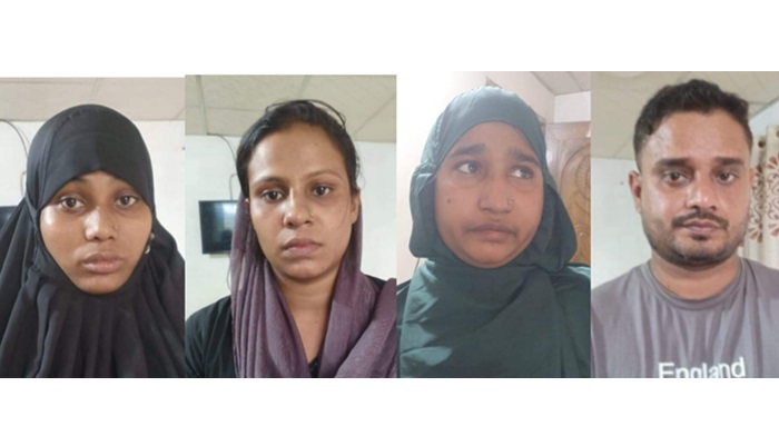 আটককৃতরা হলো পৌর শহরের পঞ্চবটি এলাকার অরুন মিয়ার বাড়ির ভাড়াটিয়া আবুল হোসেনের স্ত্রী ফাতেমা (২৭), একই এলাকার রবিন মিয়া স্ত্রী সালমা বেগম (২৭), মোস্তাক আহম্মেদ হান্নান মিয়ার ছেলে মো. সাইফ আহম্মেদ (৩২) ও ব্রাহ্মণবাড়িয়া জেলার আখাউড়া থানার আব্দুল্লাহপুর গ্রামের আনোয়ার মিয়ার স্ত্রী আমেনা আক্তার (২২)।