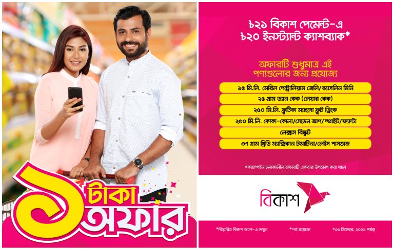 শীতে গ্রাহকদের জন্য দেশের জনপ্রিয় সুপারস্টোরগুলোতে সুনির্দিষ্ট কয়েকটি পণ্যে ১ টাকার অফার নিয়ে এলো বিকাশ। মীনা বাজার, স্বপ্ন, আগোরা, ল্যাভেন্ডার, প্রিন্স বাজার, ডেইলি শপিং, বাজার সারাবেলা, ঢালী সুপারশপ, মেহেদি মার্ট, হোলসেল ক্লাব, আমানা বিগ বাজার, এনডিআর সুপারস্টোর ও মার্ট প্রমোটারস এর ৩৪৬টি আউটলেটে ৩১ ডিসেম্বর পর্যন্ত মিলছে এই অফার। একটি পণ্যে একবারই এই অফারটি নিতে পারবেন গ্রাহকরা।