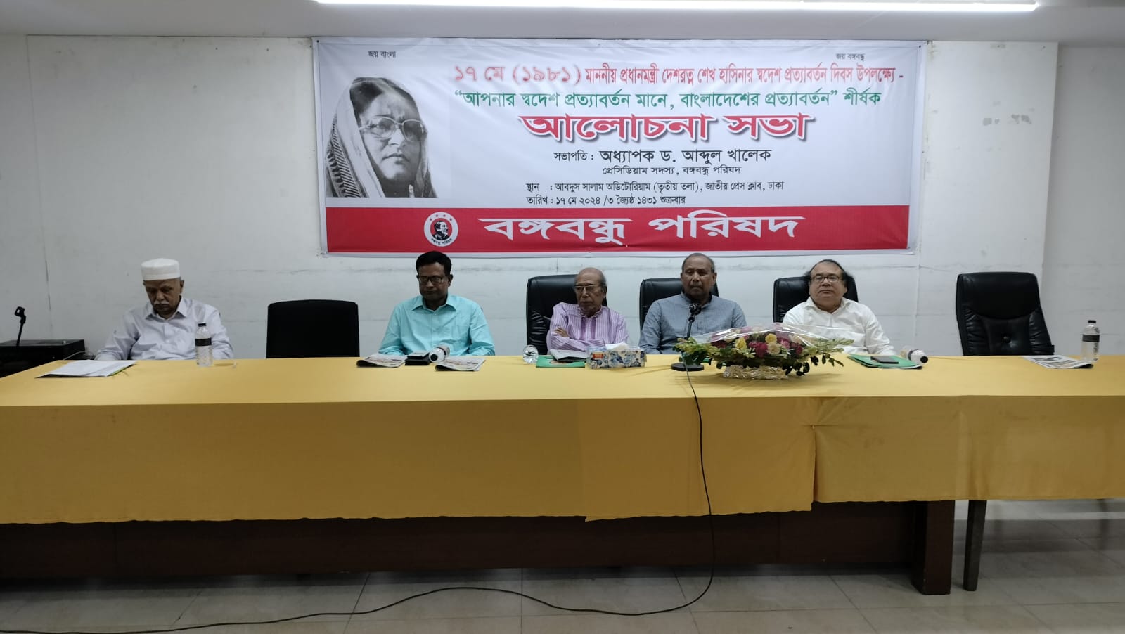 নিজস্ব প্রতিবেদকঃ গণপ্রজাতন্ত্রী বাংলাদেশ সরকারের মাননীয় প্রধানমন্ত্রী ও বাংলাদেশ আওয়ামী লীগের সভানেত্রী বঙ্গবন্ধু কন্যা দেশরত্ন জননেত্রী শেখ হাসিনার ঐতিহাসিক স্বদেশ প্রত্যাবর্তন দিবস উপলক্ষে বঙ্গবন্ধু পরিষদের উদ্যোগে ১৭ মে, শুক্রবার বিকেলে জাতীয় প্রেসক্লাবের আব্দুস সালাম হলে ‘আপনার স্বদেশ প্রত্যাবর্তন মানে, বাংলাদেশের প্রত্যাবর্তন’ শীর্ষক আলোচনা সভা অনুষ্ঠিত হয়।