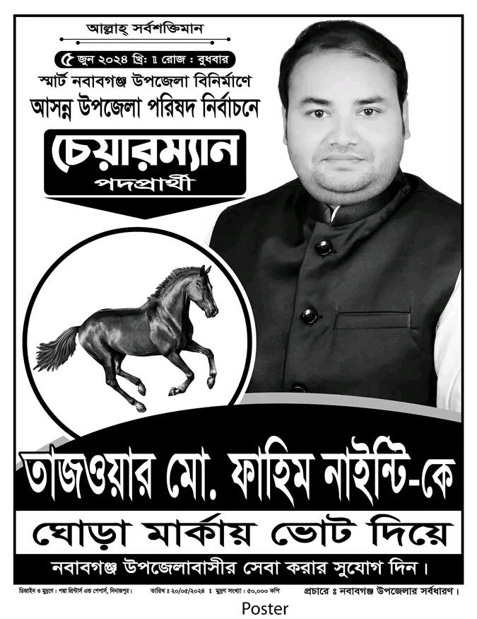 আরেকজন সমর্থক বলেন, স্মার্ট নবাবগঞ্জ উপজেলা বিনির্মাণে আসন্ন উপজেলা পরিষদ নির্বাচনে ৫ জুন ২০২৪ খ্রি. বুধবার চেয়ারম্যান পদপ্রার্থী তাজওয়ার মোহাম্মদ ফাহিমকে ঘোড়া মার্কায় আপনার মহা মূল্যবান ভোট দিয়ে উপজেলাবাসীর সার্বিক উন্নয়ন ও সেবা করার সুযোগ দিন। নবাবগঞ্জ উপজেলার প্রতিটি ভোটারের মুখে মুখে আলোচনায় শীর্ষ রয়েছেন তিনি। ঘরে ঘরে তার জনপ্রিয়তার রব উঠেছে। উপজেলার ভোটাররা ভালবেসে গ্রহণ করেছে তাকে।