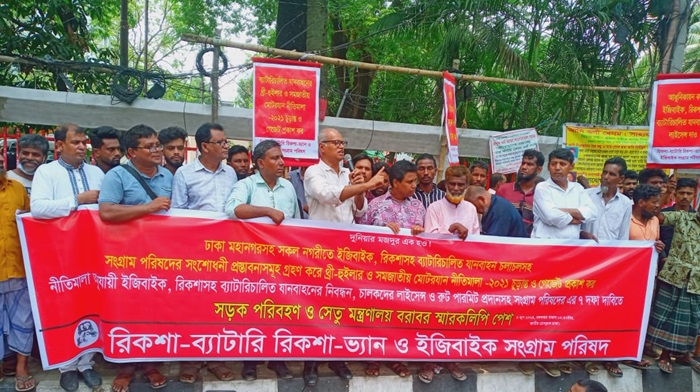 এম কাদির, ঢাকা মহানগর সহ-সভাপতি জালাল আহমেদ, যুগ্ম সম্পাদক দাউদ আলী মামুন, অর্থ সম্পাদক রোখশানা আফরোজ আশা, তানভীর নাঈম, সদস্য সেকান্দার আলী, সুমন খান, আব্দুস সালাম, মোশাররফ হোসেন, জয়নাল আবেদীন। সমাবেশে নেতৃবৃন্দ বলেন, আপনারা জানেন রিক্সা চালানো কত অমানবিক পরিশ্রমের কাজ। সাম্প্রতিক প্রচন্ড দাবদাহে যারা মৃত্যুবরণের করেছেন তাদের অধিকাংশ রিকশাচালক। চালকনের এই পরিশ্রম লাঘব করা, যাত্রীদের স্বাচ্ছন্দ্যের কথা বিবেচনা করে সম্পূর্ণ দেশীয় পদ্ধতিতে রিক্সায় ব্যাটারি স্থাপন করা হয়। এখন তার দুর্বলতা কাটিয়ে অনেক আধুনিকায়ন হয়েছে। ফলে দ্রুত এই যানবাহন সারাদেশে ছড়িয়ে পড়েছে। সারাদেশে প্রায় ৫০ লাখ চালক পরিবার এইসব ব্যাটারি চালিত থ্রি হুইলার চালানোর উপর প্রত্যক্ষভাবে নির্ভরশীল। এইসব যানবাহন তৈরি, মেরামত, খুচরা যন্ত্রাংশ নির্মাণ, ব্যাটারি, পার্টস বিক্রিসহ নানা ধরনের কাজে আরোও প্রায় ১০ লাখ মানুষের জীবন জীবিকা নির্বাহ করে। ঢাকা মহানগরসহ বিভিন্ন জেলা ও বিভাগের পর্যাপ্ত নগর পরিবহন না থাকায় কোটি কোটি মানুষ এ পরিবহন ব্যবহার করে। দেশে বিপুল কর্মসংস্থানের পাশাপাশি দেশের অর্থনীতিতেও গুরুত্বপূর্ণ ভূমিকা পালন করছে এ সেক্টরের সাথে যুক্ত মানুষেরা।