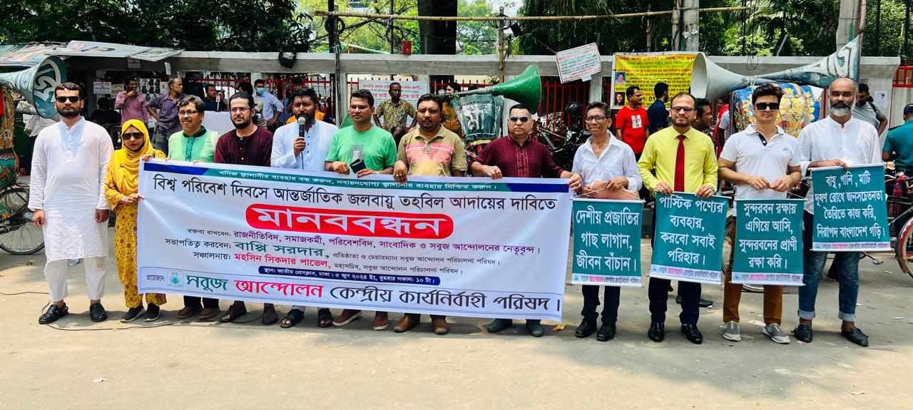 আজ ৫ জুন (বুধবার) সকালে জাতীয় প্রেসক্লাবের সামনে বিশ্ব পরিবেশ দিবস উপলক্ষে পরিবেশবাদী সংগঠন সবুজ আন্দোলন কেন্দ্রীয় কার্যনির্বাহী পরিষদের উদ্যোগে আন্তর্জাতিক জলবায়ু তহবিল আদায়ের দাবিতে মানববন্ধনের আয়োজন করে।