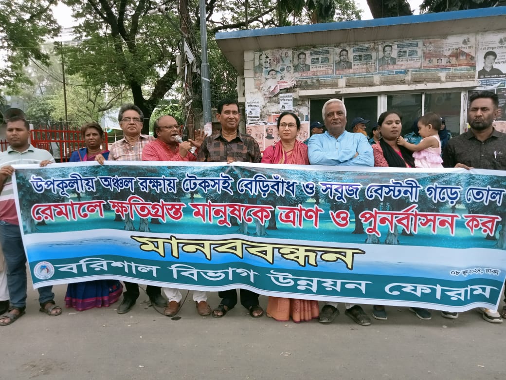 বক্তারা বাংলাদেশের উপক’ল রক্ষায় টেকসই বেড়িবাধ নির্মাণ ও সবুজ বেষ্টনী গড়ে তোলার কোন বিকল্প নাই। কিন্তু গত ৬ জুন ২০২৪ ঘোষিত বাজেটে এ ব্যাপারে কোন সুনির্দিষ্ট বরাদ্দ ও দিক নির্দেশনা নাই। এতে করে উপকূলীয় বাসিন্দারা ক্ষুব্ধ হয়েছেন। উপকূলীয় অঞ্চলের অধিবাসীরা মনে করেছিল অতিসম্প্রতি সংঘঠিত হয়ে যাওয়া প্রবল ঘূর্ণিঝড়ে যে জানমালের অপরিসীম ক্ষয়-ক্ষতি হয়েছে তা পুশিয়ে নেয়ার ক্ষেত্রে ঘোষিত বাজেটে বরাদ্দ রাখা হবে, কিন্তু রাখা হয়নি। বাংলাদেশের উপকূলীয় অঞ্চল হচ্ছে সবুজ ও নীল অর্থনীতির সমৃদ্ধ অঞ্চল। এ অঞ্চলকে সুরক্ষা করতে পারলে দেশের ভাগ্য পরিবর্তন করা সম্ভব। এ জন্য সরকারের মহাপরিকল্পনা গ্রহণ করা জরুরী। কিন্তু বিগত ৫৪ বছর বাংলাদেশে কোন সরকারই এ বিষয়টি গুরুত্বের সাথে বিবেচনা করেনি। ১৯৭০ সালে প্রলয়ংকারী ঘূর্ণিঝড়ে এই অঞ্চলের ৩ লক্ষ মানুষ প্রাণ হারিয়েছিল। জাতির পিতা বঙ্গবন্ধু শেখ মুজিবুর রহমান ঘূর্ণিবিধ্বস্ত অঞ্চল সফর করে অশ্রুসিক্ত নয়নে বলেছিল, বাংলাদেশের উপকূল অঞ্চলের মানুষকে সুরক্ষার প্রয়োজনীয় ব্যবস্থা গ্রহণ করা হবে। বঙ্গবন্ধুর কন্যার শেখ হাসিনা একটানা চতুর্থবারের মত ক্ষমতায় থাকার পরেও উপকূলীয় অঞ্চলের মানুষের এই দুঃখ দুর্দশা দূর হয়নি। ঘূর্ণিঝড় ও জলোচ্ছাসে এখনও মানুষ প্রাণ হারায়। অথচ আমরা জানি ইউরোপের একটি দেশ নেদারল্যান্ড সমুদ্র পৃষ্ঠের নীচে অবস্থান করলেও তারা সমুদ্র কূলবর্তী এলাকায় বেড়িবাধ নির্মাণ করে দেশ ও দেশের মানুষকে সুরক্ষা দিয়েছে। বাংলাদেশ নেদারল্যান্ড থেকে শিক্ষা গ্রহণ করে বাংলাদেশের উপকূলীয় অঞ্চলকে রক্ষা করতে পারে এবং দেশের ভাগ্য পরিবর্তন ঘটাতে পারে। এর জন্য দরকার রাজনৈতিক সদিচ্ছা। যদিও বর্তমান প্রধানমন্ত্রী শেখ হাসিনা পদ্মাসেতু নির্মাণের মধ্যদিয়ে দক্ষিণাঞ্চলের মানুষের চলাচলের অনেক অসুবিধা লাঘব করেছে। এ জন্য বরিশাল বিভাগের মানুষের পক্ষ থেকে মাননীয় প্রধানমন্ত্রী শেখ হাসিনাকে অভিনন্দন। বরিশাল বিভাগ উন্নয়ন ফোরাম মনে করে পদ্মাসেতু জাজিরা পয়েন্ট থেকে পায়রাবন্দর সংযোগ সেতু ও সড়ক নির্মাণ করা হলে অত্র এলাকার মানুষের শতবছরের দুঃখ-কষ্ট লাঘব হতে পারে এবং তার প্রভাব জাতীয় অর্থনীতিতে পড়বে।