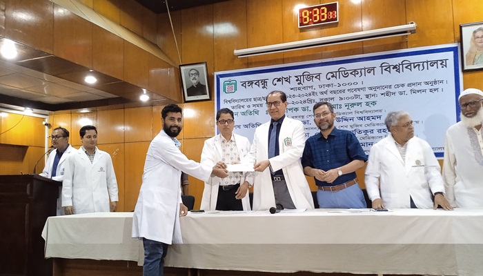 বঙ্গবন্ধু শেখ মুজিব মেডিক্যাল বিশ্ববিদ্যালয়ের শহীদ ডা. মিলন হলে আজ বৃহস্পতিবার ১৩ জুন ২০২৪ইং তারিখে অত্র বিশ্ববিদ্যালয়ে উচ্চতর চিকিৎসা শিক্ষায় অধ্যয়নরত গবেষক চিকিৎসক-ছাত্রছাত্রীদের মাঝে স্বাস্থ্য ও চিকিৎসাসেবা বিষয়ক গবেষণা অনুদান প্রদান করা হয়েছে। বঙ্গবন্ধু শেখ মুজিব মেডিক্যাল বিশ্ববিদ্যালয়ের মাননীয় উপাচার্য অধ্যাপক ডা. দীন মোঃ নূরুল হক (চৎড়ভ. উৎ. উববহ গড়যফ. ঘড়ড়ৎঁষ ঐঁয়) উপস্থিত থেকে মোট ৪ শত ৩৮ জন ছাত্রছাত্রীদের হাতে ২০২৩-২০২৪ অর্থ বছরের গবেষণার (থিথিস গ্রান্টের) চেক তুলে দেন। সর্বমোট ৫ কোটি ৩১ লক্ষ ৪৩ হাজার টাকার চেক প্রদান করা হয়। সর্বোচ্চ একজন চিকিৎসককে গবেষণার জন্য দেড় লক্ষ টাকার গবেষণা মঞ্জুরী প্রদান করা হয়।