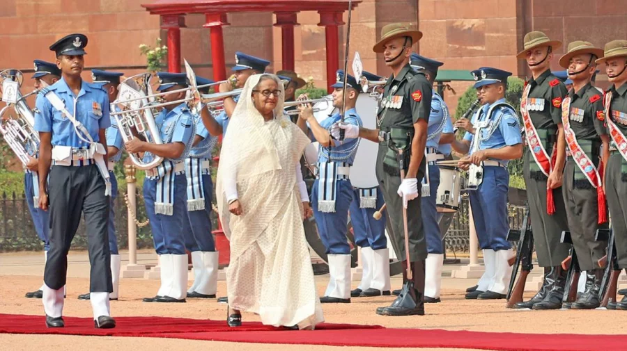 এরপর প্রধানমন্ত্রীকে দেওয়া হয় রাজকীয় সংবর্ধনা ও গার্ড অব অনার। এ সময় বাংলাদেশ ও ভারতের জাতীয় সঙ্গীত পরিবেশন করা হয়। সশস্ত্র সালাম গ্রহণের পর প্রধানমন্ত্রী শেখ হাসিনা গার্ড অব অনার পরিদর্শন করেন।