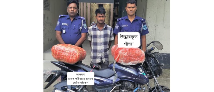 কুড়িগ্রাম জেলা প্রতিনিধি: কুড়িগ্রাম জেলা পুলিশের মাদক বিরোধী অভিযানের অংশ হিসেবে জেলার ভূরুঙ্গামারী থানা পুলিশের একটি চৌকস টিম সম্মানিত স্থানীয় নাগরিকদের সহায়তায় অদ্য ২৭ জুন ২০২৪ রাত আনুমানিক ১২.১০ ঘটিকার সময় ভূরুঙ্গামারী থানাধীন বারুইটারী সুধাংসু মোড় এলাকা থেকে পশ্চিম বাগভান্ডার এলাকার মাদক কারবারি মোঃ জিয়ারুল ইসলাম @জুম্মান (২৫)'কে একটি মোটরসাইকেলে মাদক পরিবহনের সময় ২৩ কেজি গাঁজাসহ হাতেনাতে গ্রেফতার করে। এসময় মাদক পরিবহনে ব্যবহৃত মোটরসাইকেলটি জব্দ করে পুলিশ । উক্ত মাদক কারবারির বিরুদ্ধে বগুড়া জেলার নন্দিগ্রাম থানায় পূর্বের ১ টি মাদক মামলার রয়েছে।